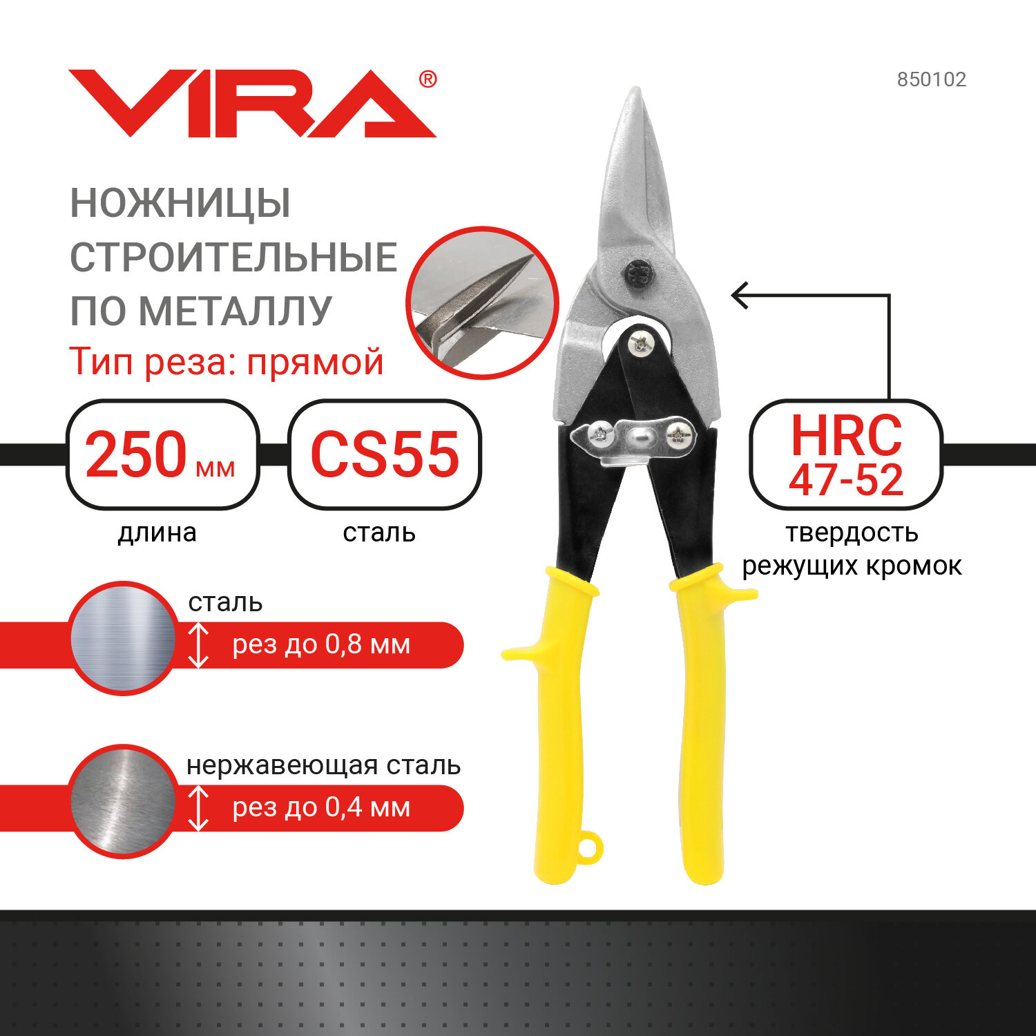 Ножницы по металлу прямого реза, 250 мм VIRA оснащены удобными рукоятками из поливинилхлорида, с выступами для защиты пальцев. Такие ручки имеют дополнительный упор, что позволяет прикладывать больше усилий. Инструмент создан из специальной высокоуглеродистой стали. Твердость режущей кромки достигает 47-52 HRC, что позволяет резать сталь до 0,8 мм толщиной.