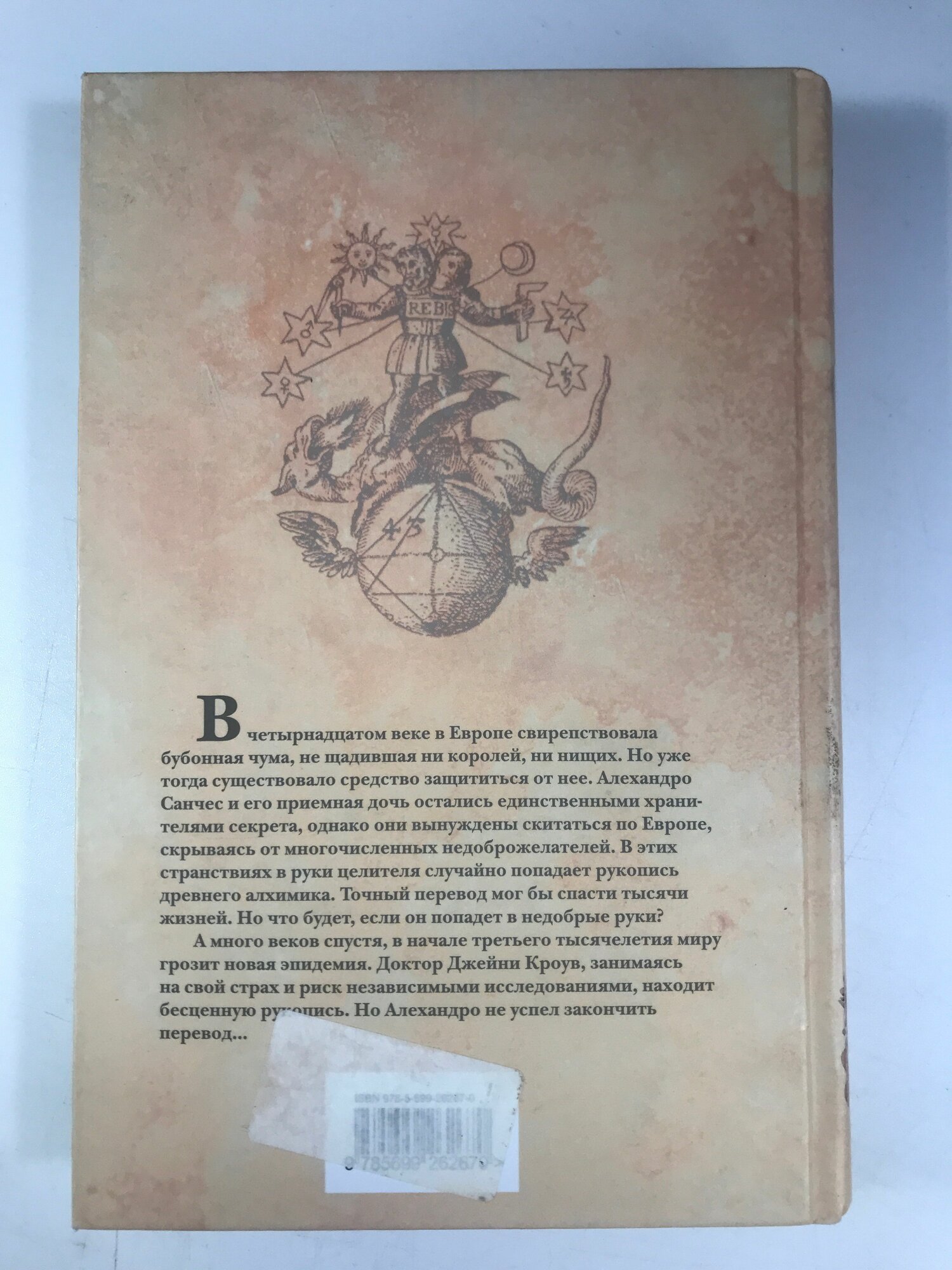 В четырнадцатом веке в Европе свирепствовала бубонная чума, не щадившая ни королей, ни нищих. Но уже тогда существовало средство защититься от нее. Алехандро Санчес и его приемная дочь остались единственными хранителями секрета, однако они вынуждены скитаться по Европе, скрываясь от многочисленных недоброжелателей. В этих странствиях в руки целителя случайно попадает рукопись древнего алхимика. Точный перевод мог бы спасти тысячи жизней. Но что будет, если он попадет в недобрые руки? А много веков спустя, в начале третьего тысячелетия миру грозит новая эпидемия. Доктор Джейни Кроув, занимаясь на свой страх и риск независимыми исследованиями, находит бесценную рукопись. Но Алехандро не успел закончить перевод. Переводчик: Б. Жужунава.