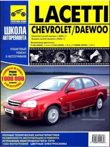 Руководство по ремонту, техническому обслуживанию и эксплуатации автомобилей Chevrolet Lacetti и Daewoo Lacetti, оборудованных бензиновыми двигателями F14D, F16D, F18SED рабочим объемом 1,4, 1,6, 1,8 л. Все подразделы, в которых описаны обслуживание и ремонт агрегатов и систем, содержат перечни возможных неисправностей и рекомендации по их устранению, а также указания по разборке, сборке, регулировке и ремонту узлов и систем автомобиля с использованием стандартного набора инструментов в условиях гаража. Указания по разборке, сборке, регулировке и ремонту узлов и систем автомобиля с использованием готовых запасных частей и агрегатов приведены пооперационно и подробно иллюстрированы цветными фотографиями и рисунками, благодаря которым даже начинающий автолюбитель легко разберется в ремонтных операциях. Структурно все ремонтные работы разделены по системам и агрегатам, на которых они проводятся (начиная с двигателя и заканчивая кузовом). По мере необходимости операции снабжены предупреждениями и полезными советами на основе практики опытных автомобилистов. Структура книги составлена так, что фотографии или рисунки без порядкового номера являются графическим дополнением к последующим пунктам. При описании работ, которые включают в себя промежуточные операции, последние указаны в виде ссылок на подраздел и страницу, где они подробно описаны. В приложениях содержатся необходимые для эксплуатации, обслуживания и ремонта сведения о моментах затяжки резьбовых соединений, горюче-смазочных материалах и эксплуатационных жидкостях, применяемых лампах и свечах зажигания. В конце книги приведены цветные электросхемы. Книга предназначена для автолюбителей и специалистов СТО.