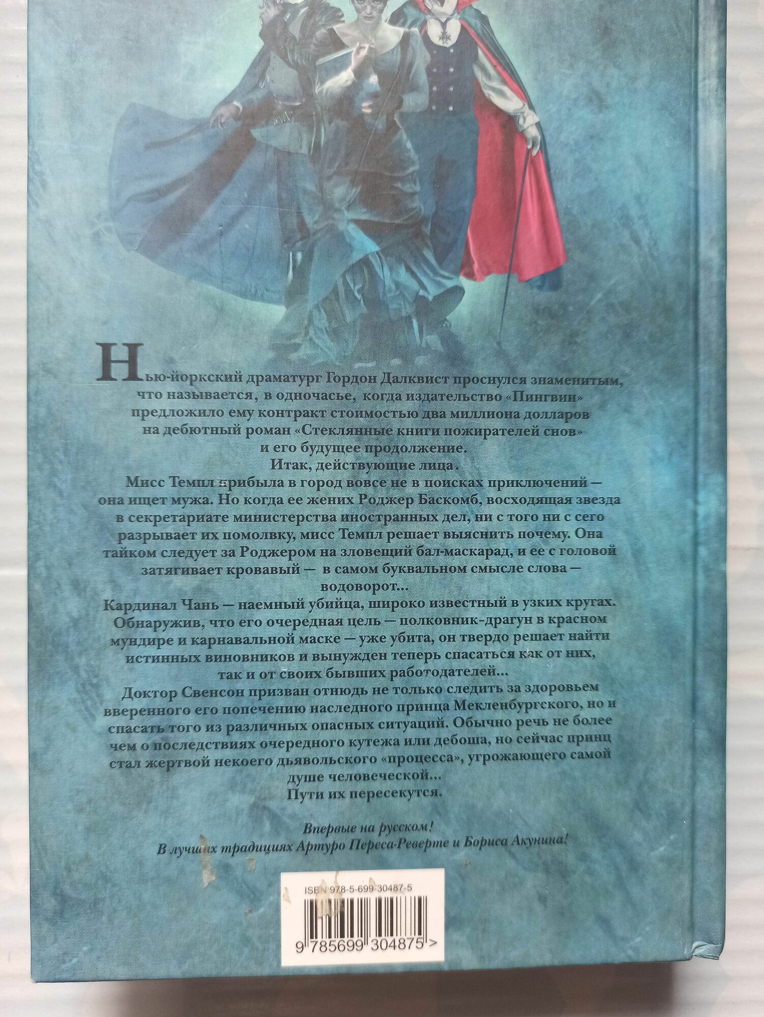 Нью-йоркский драматург Гордон Далквист проснулся знаменитым, что называется, в одночасье, - когда издательство "Пингвин" предложило ему контракт стоимостью два миллиона долларов на дебютный роман "Стеклянные книги пожирателей снов" и его будущее продолжение. Итак, действующие лица: Мисс Темпл прибыла в город вовсе не на поиск приключений - она ищет мужа. Но когда ее жених Роджер Баскомб, восходящая звезда в секретариате министерства иностранных дел, ни с того ни с сего разрывает их помолвку, мисс Темпл решает выяснить почему. Она тайком следует за Роджером на зловещий бал-маскарад, и ее с головой затягивает кровавый - в самом буквальном смысле слова - водоворот. Кардинал Чань - наемный убийца, широко известный в узких кругах. Обнаружив, что его очередная цель - полковник драгун в красном мундире и карнавальной маске - уже убита, он твердо решает найти истинных виновников и вынужден теперь спасаться как от них, так и от своих бывших работодателей. Доктор Свенсон призван отнюдь не только следить за здоровьем вверенного его попечению наследного принца Мекленбургского, но и спасать того из различных опасных ситуаций. Обычно речь не более чем о последствиях очередного кутежа или дебоша, но сейчас принц стал жертвой некоего дьявольского "процесса", угрожающего самой душе человеческой. Пути их пересекутся. Впервые на русском языке. В лучших традициях Артуро Переса-Реверте и Бориса Акунина!