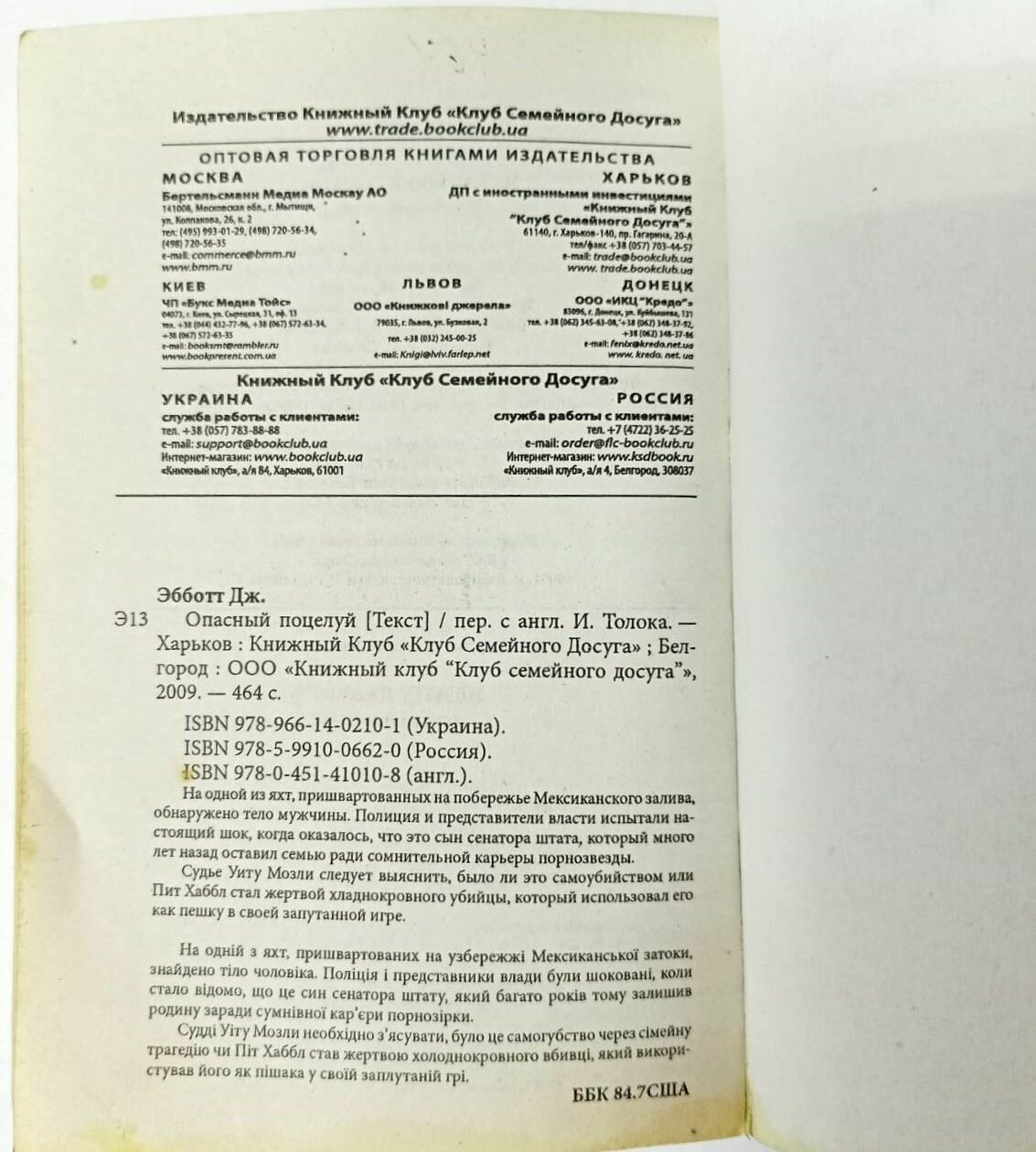 Книга: Опасный поцелуй (Эбботт Джефф); Клуб семейного досуга, 2009