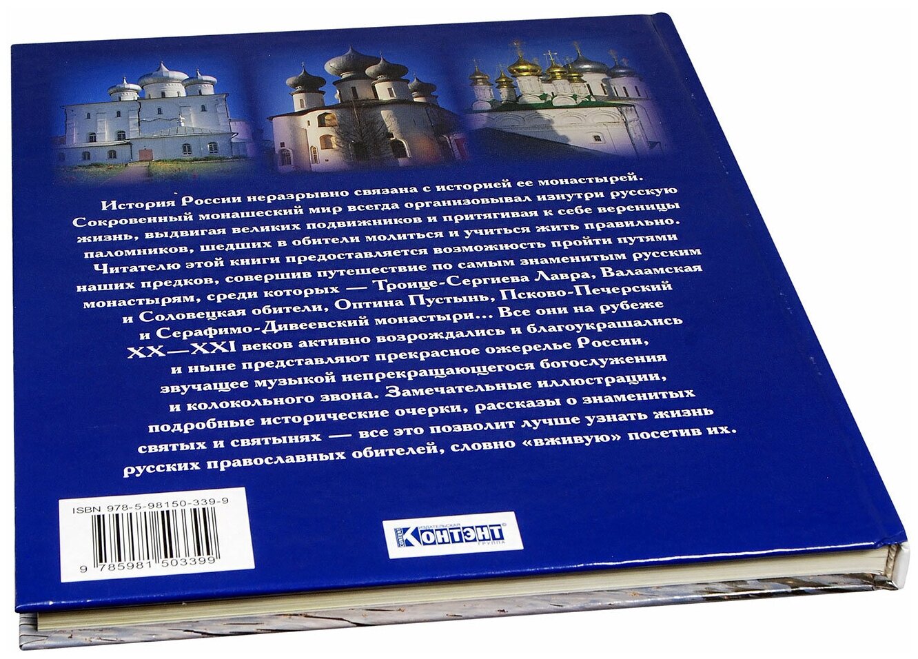 История России неразрывно связана с историей ее монастырей. Сокровенный монашеский мир всегда организовывал изнутри русскую жизнь, выдвигая великих подвижников и притягивая к себе вереницы паломников, шедших в обители молиться и учиться жить правильно. Читателю этой книги предоставляется возможность пройти путями наших предков, совершив путешествие по самым знаменитым русским монастырям, среди которых - Троице-Сергиева Лавра, Валаамская и Соловецкая обители, Оптина Пустынь, Псково-Печерский и Серафимо-Дивеевский монастыри. Все они на рубеже XX-XXI веков активно возрождались и благоукрашались и ныне представляют прекрасное ожерелье России, звучащее музыкой непрекращающегося богослужения и колокольного звона. Замечательные иллюстрации, подробные исторические очерки, рассказы о знаменитых святых и святынях - все это позволит лучше узнать жизнь русских православных обителей, словно "вживую" посетив их.