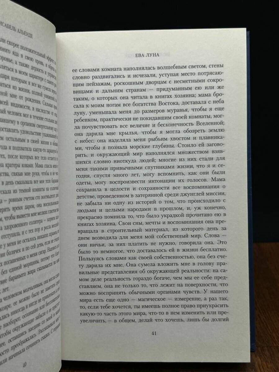 Впервые на русском языке - волшебная книга для женщин! Исабель Альенде - одна из наиболее известных латиноамериканских писательниц - увенчана множеством премий и литературных званий. Начиная с первых романов - "Дом духов" и "Любовь и тьма" и вплоть до таких книг, как "Ева Луна", "Сказки Евы Луны", "Дочь фортуны", "Портрет в коричневых тонах", литературные критики воспринимают ее как суперзвезду латиноамериканского магического реализма. Суммарный тираж ее книг уже превысил сорок миллионов экземпляров, ее романы переведены на три десятка языков. "Ева Луна" - это выдержанное в духе волшебной сказки повествование о судьбе девочки, появившейся на свет "с дыханием сельвы, уже запечатленным в памяти". Рано осиротевшая Ева с замиранием сердца слушает радиопьесы, мечтая о том, что в один прекрасный миг взмахнет крыльями и улетит. Впоследствии она сама начинает создавать берущие за душу истории, подобно могущественной фее, управляя судьбами героев.
