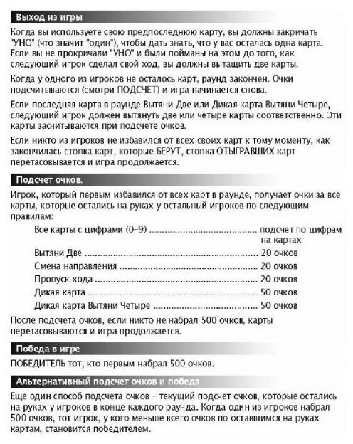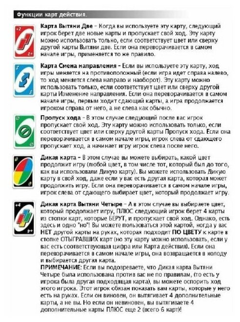 | Описание | Победителем в игре считается игрок, первым набравший 500 очков и избавившийся от карт раньше остальных участников. Как только у игрока на руках остается последняя карта, необходимо срочно крикнуть «Уно», что означает «одна», иначе необходимо будет снова взять несколько карт в руку. В комплект игры входят 108 игровых карт, поделенных на соответствующие цвета.,Для того, чтобы игра приносила только приятные впечатления, в комплекте есть подробная и понятная инструкция и правила игры. |