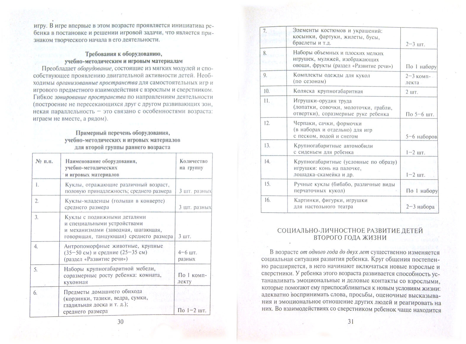 В методическом пособии представлен перечень оборудования, учебно-методических и игровых материалов для оснащения различных помещений дошкольного учреждения с учетом их функционального назначения. В пособии представлены основные требования к оборудованию, учебно-методическим и игровым материалам для детей 1-й и 2-й группы раннего возраста и перечень материалов для осуществления педагогического процесса по физическому, социально-личностному, познавательно-речевому, художественно-эстетическому развитию детей, совершенствованию их игровой деятельности. Адресовано педагогам дошкольных образовательных учреждений разных видов. Может использоваться в образовательном процессе педагогических колледжей и вузов для подготовки специалистов по направлению 050700 - Педагогика и специальностям "031100 - Педагогика и методика дошкольного образования", "030900 - Дошкольная педагогика и психология".