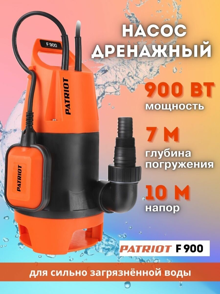 Дренажный насос для грязной воды Patriot F900, мощность 900Вт, центробежный, погружной, производительность до 14000л/ч, глубина погружения до 7м (315302409)