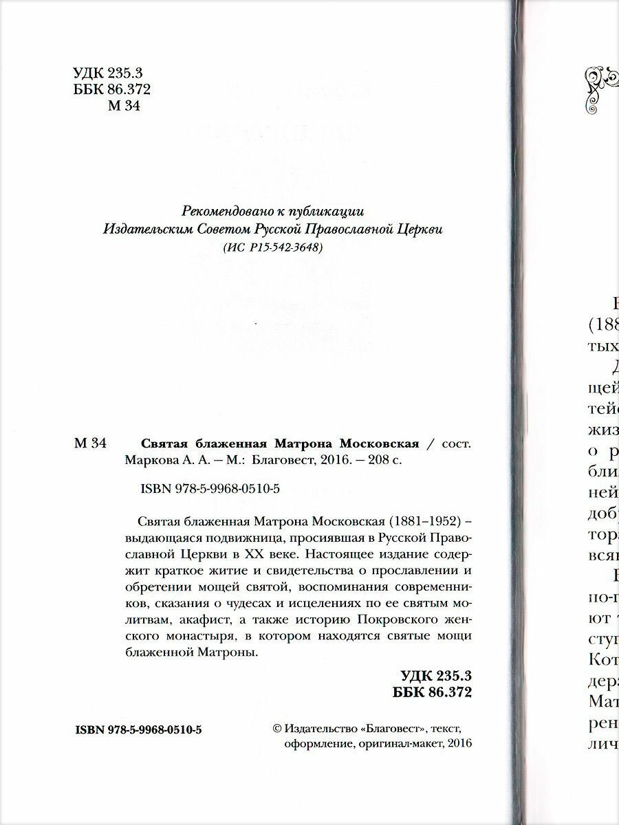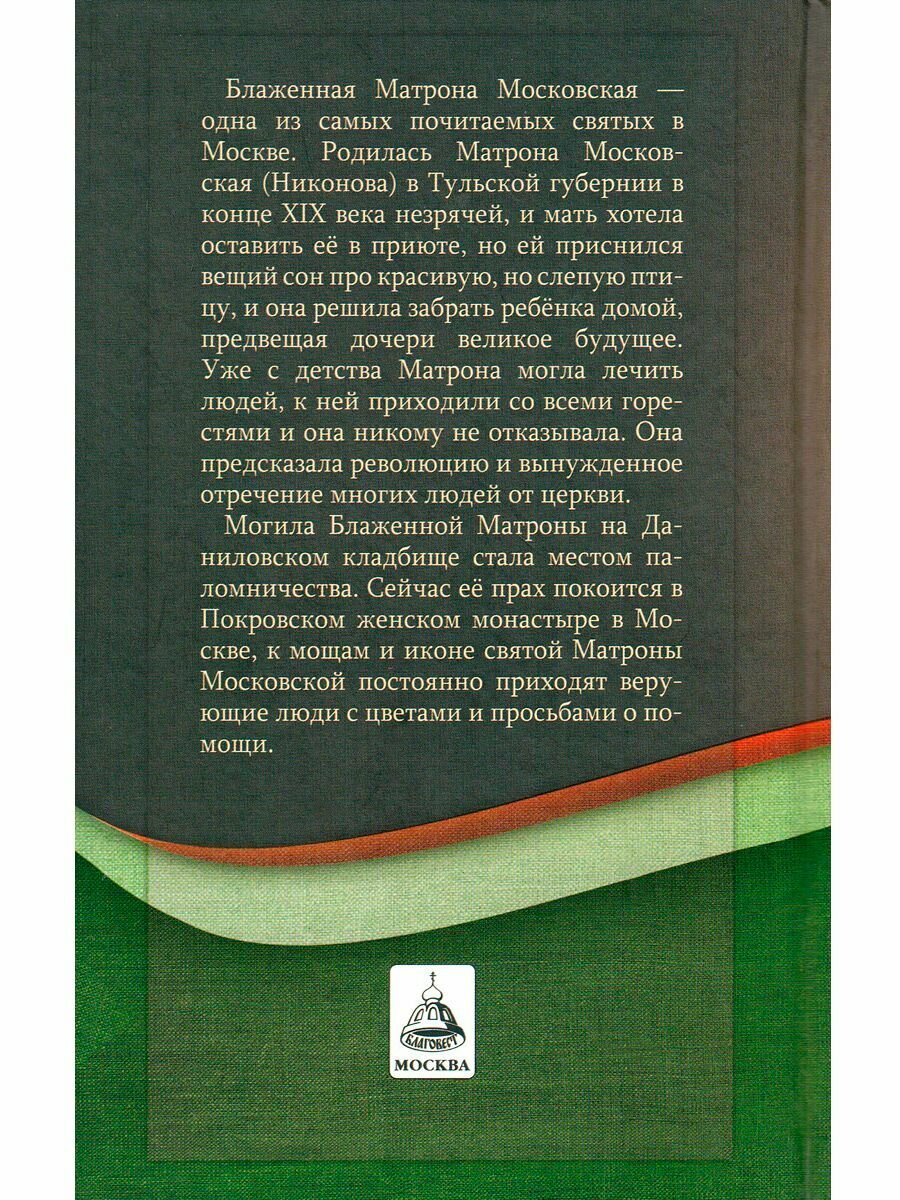 Святая блаженная Матрона Московская (1885-1952) - выдающаяся подвижница, просиявшая в Русской Православной Церкви в XX веке. Настоящее издание содержит краткое житие и свидетельства о прославлении и обретении мощей святой, воспоминания современников, сказания о чудесах и исцелениях по ее святым молитвам, акафист, а также историю Покровского женского монастыря, в котором находятся святые мощи блаженной Матроны. Составитель: А. А. Маркова.