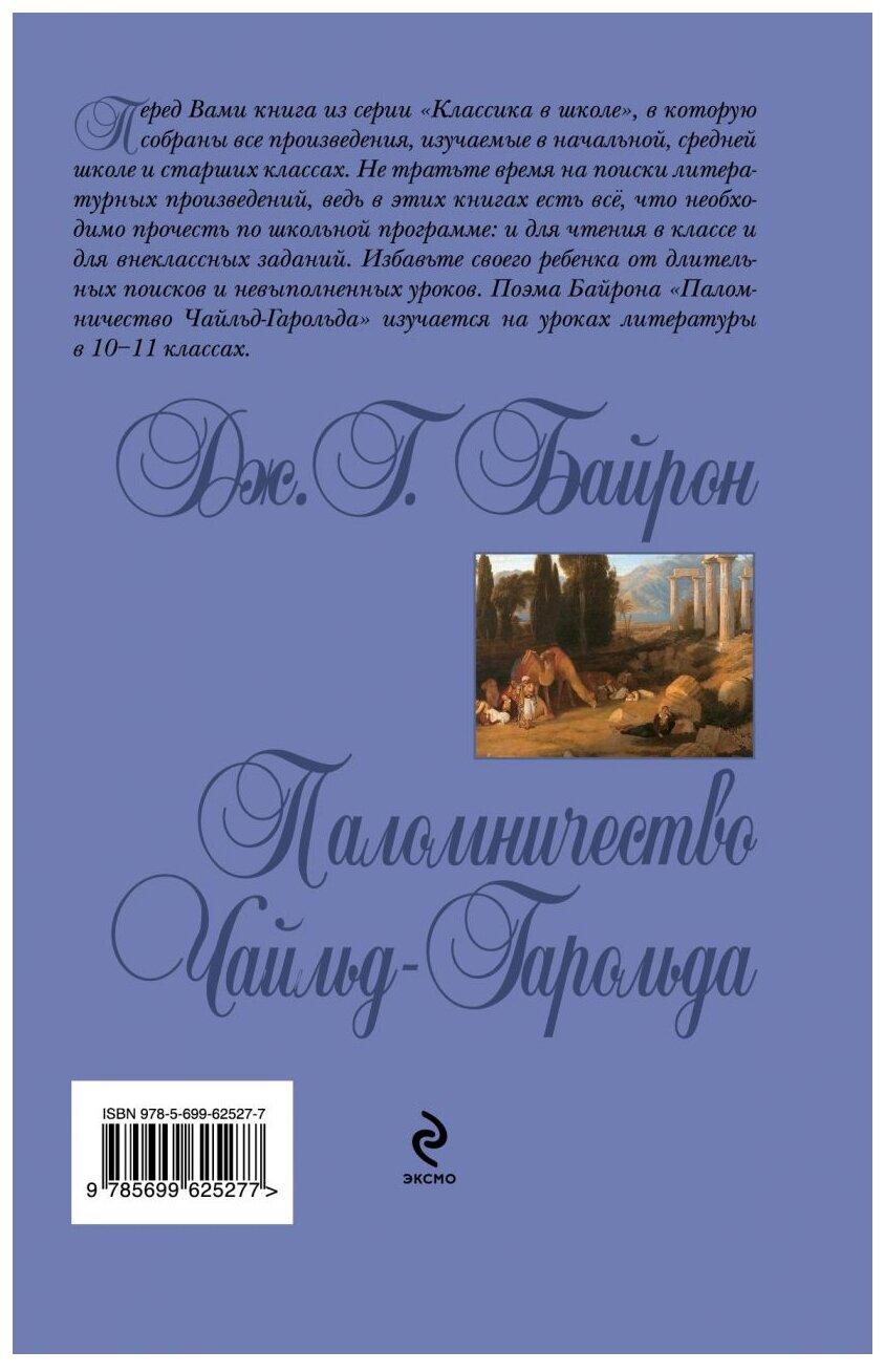 Перед Вами книга из серии "Классика в школе", в которую собраны все произведения, изучаемые в начальной, средней школе и старших классах. Не тратьте время на поиски литературных произведений, ведь в этих книгах есть все, что необходимо прочесть по школьной программе: и для чтения в классе, и для внеклассных заданий. Избавьте своего ребенка от длительных поисков и невыполненных уроков. Поэма Байрона "Паломничество Чайльд-Гарольда" изучается на уроках литературы в 10-11 классах. Для среднего школьного возраста.