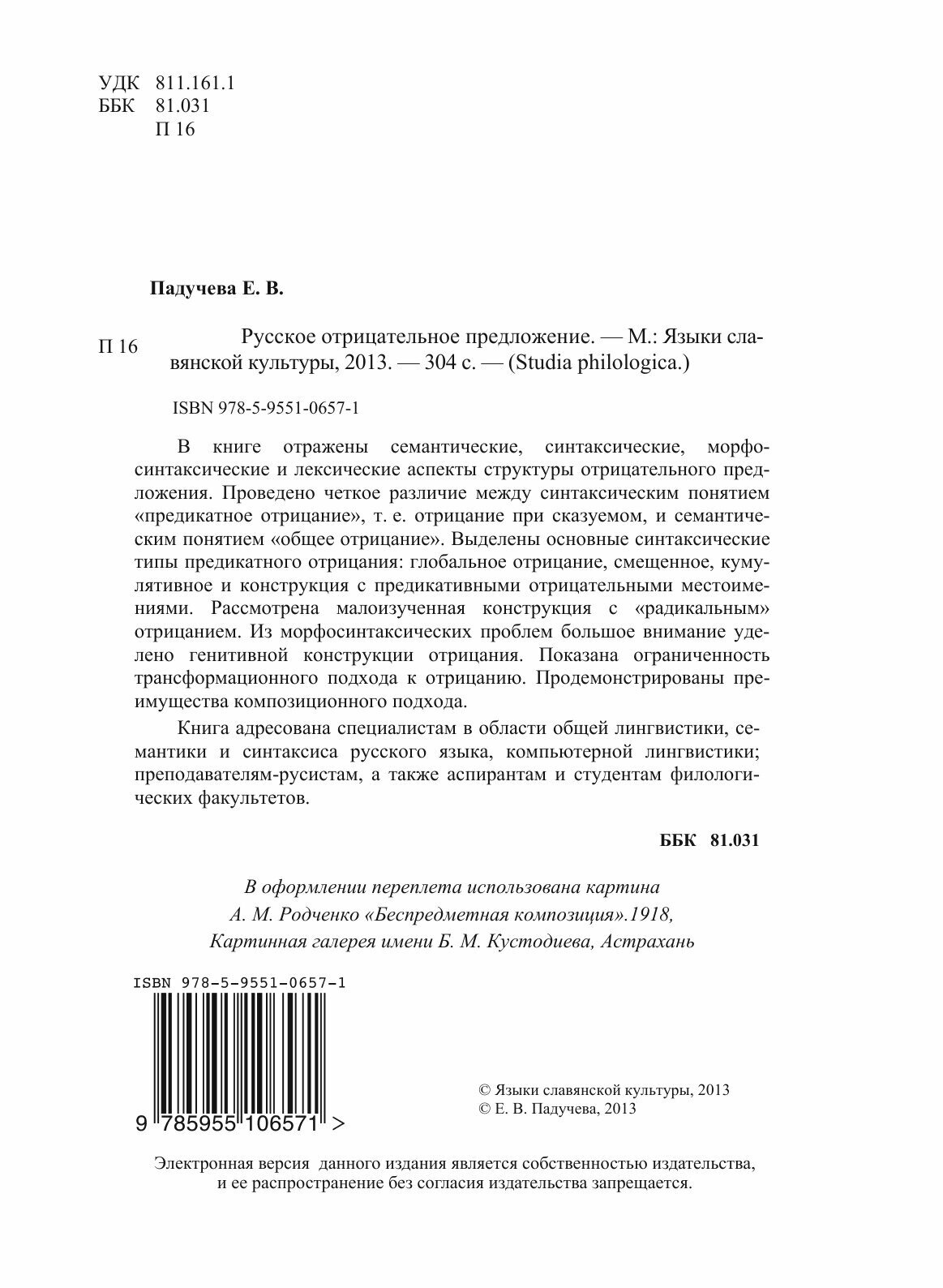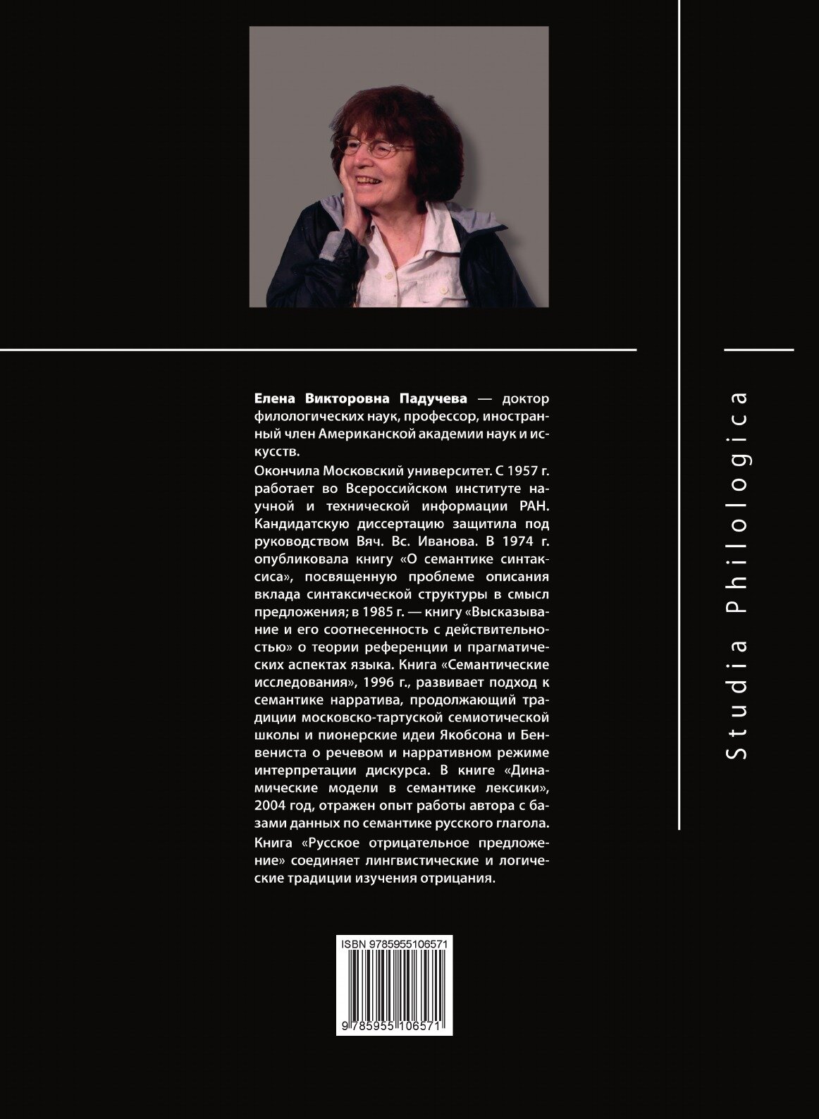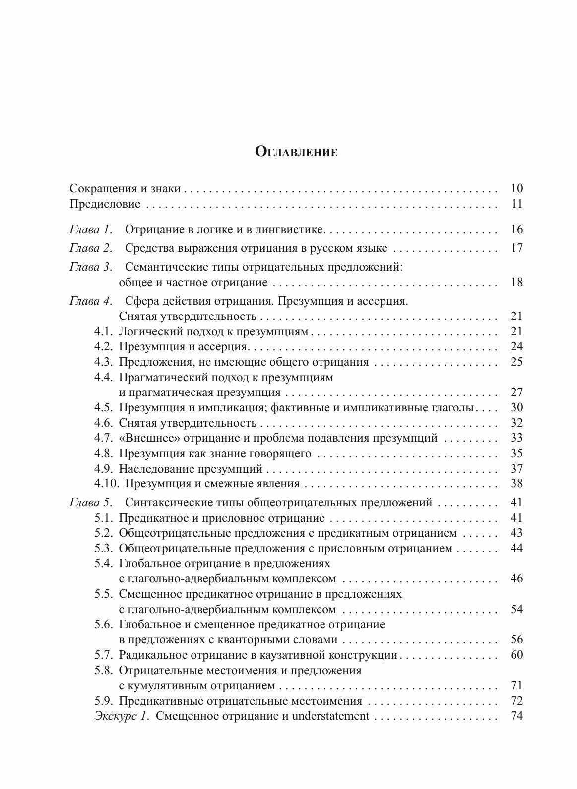 В книге отражены семантические, синтаксические, морфо-синтаксические и лексические аспекты структуры отрицательного предложения. Проведено четкое различие между синтаксическим понятием "предикатное отрицание", т. е. отрицание при сказуемом, и семантическим понятием "общее отрицание". Выделены основные синтаксические типы предикатного отрицания: глобальное отрицание, смещенное, кумулятивное и конструкция с предикативными отрицательными местоимениями. Рассмотрена малоизученная конструкция с "радикальным" отрицанием. Из морфосинтаксических проблем большое внимание уделено генитивной конструкции отрицания. Показана ограниченность трансформационного подхода к отрицанию. Продемонстрированы преимущества композиционного подхода. Книга адресована специалистам в области общей лингвистики, семантики и синтаксиса русского языка, компьютерной лингвистики; преподавателям-русистам, а также аспирантам и студентам филологических факультетов.