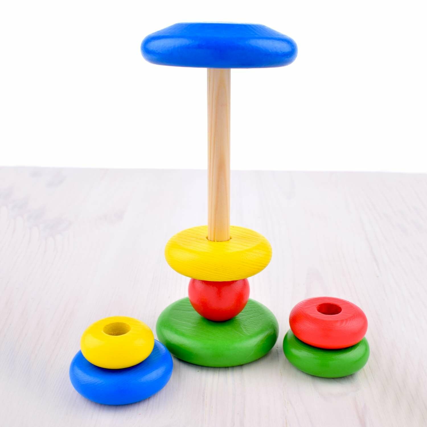 Материал для производства всех видов пирамидок — дерево. Яркие цвета нанесены с помощью красок на водной основе, безопасных для самых маленьких детей.