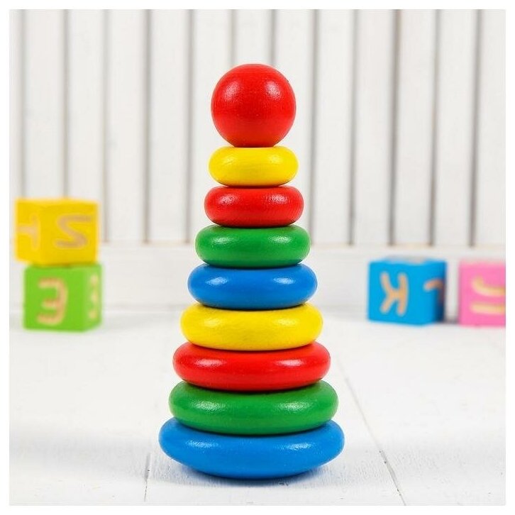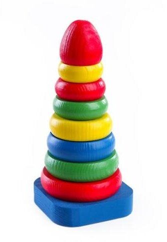8 деревянных цветных колец различного размера и вершина пирамиды