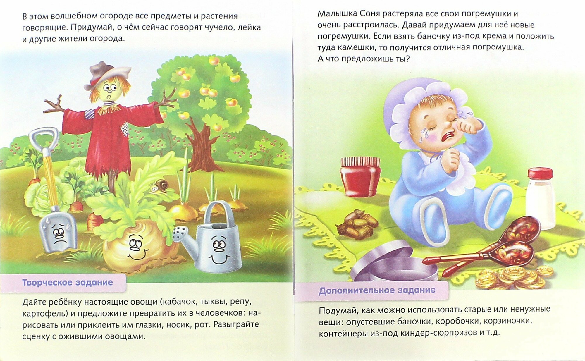 В книге 15 заданий, представляющих для ребенка возможность "выдумывать" по заданной теме. Задание направлены как на фантазирование (сказка, фантастика), но и на обговаривание существующих вещей (составление предложений, изображение эмоций). Рисунки мягкие, дружелюбные. Нет перенасыщенности мелкими ненужными деталями. Свою цену полностью оправдывает.