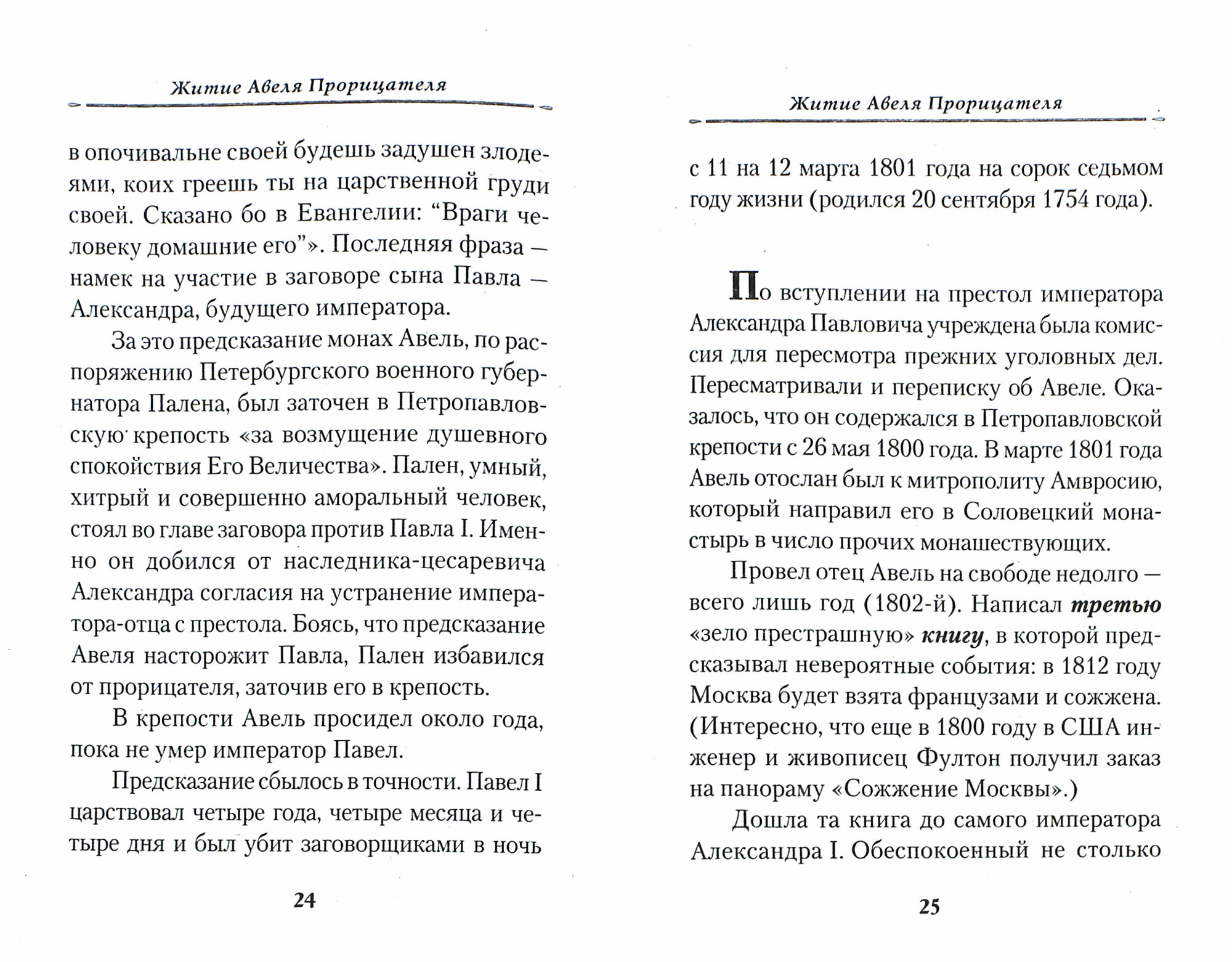 Таинственностью, трагизмом и удивительно точными и страшными предсказаниями выделяется монах Авель, получивший прозвище Вещий. Пророчества Авеля касались русской истории на огромный временной отрезок - от правления Великой Екатерины до правления Николая II. А возможно, и далее. По некоторым утверждениям - до самого что ни на есть конца. Монах Авель всегда оставался глубоко верующим человеком, чтившим Церковь. "Его жизнь достойна ужаса и удивления" - так было написано в одной из древних рукописей, озаглавленной: "Жития и страдания отца и монаха Авеля". Составитель: Посадский Н. С.
