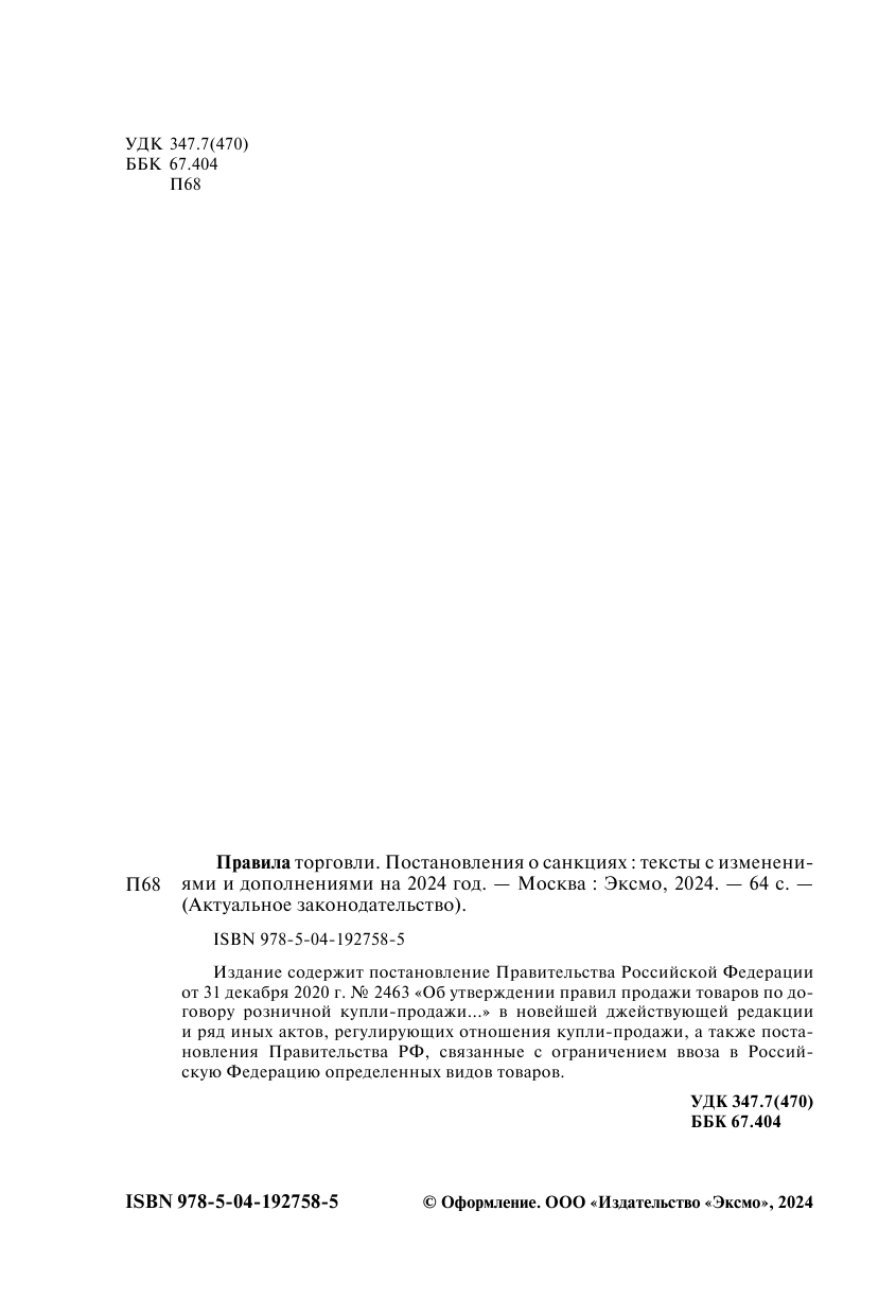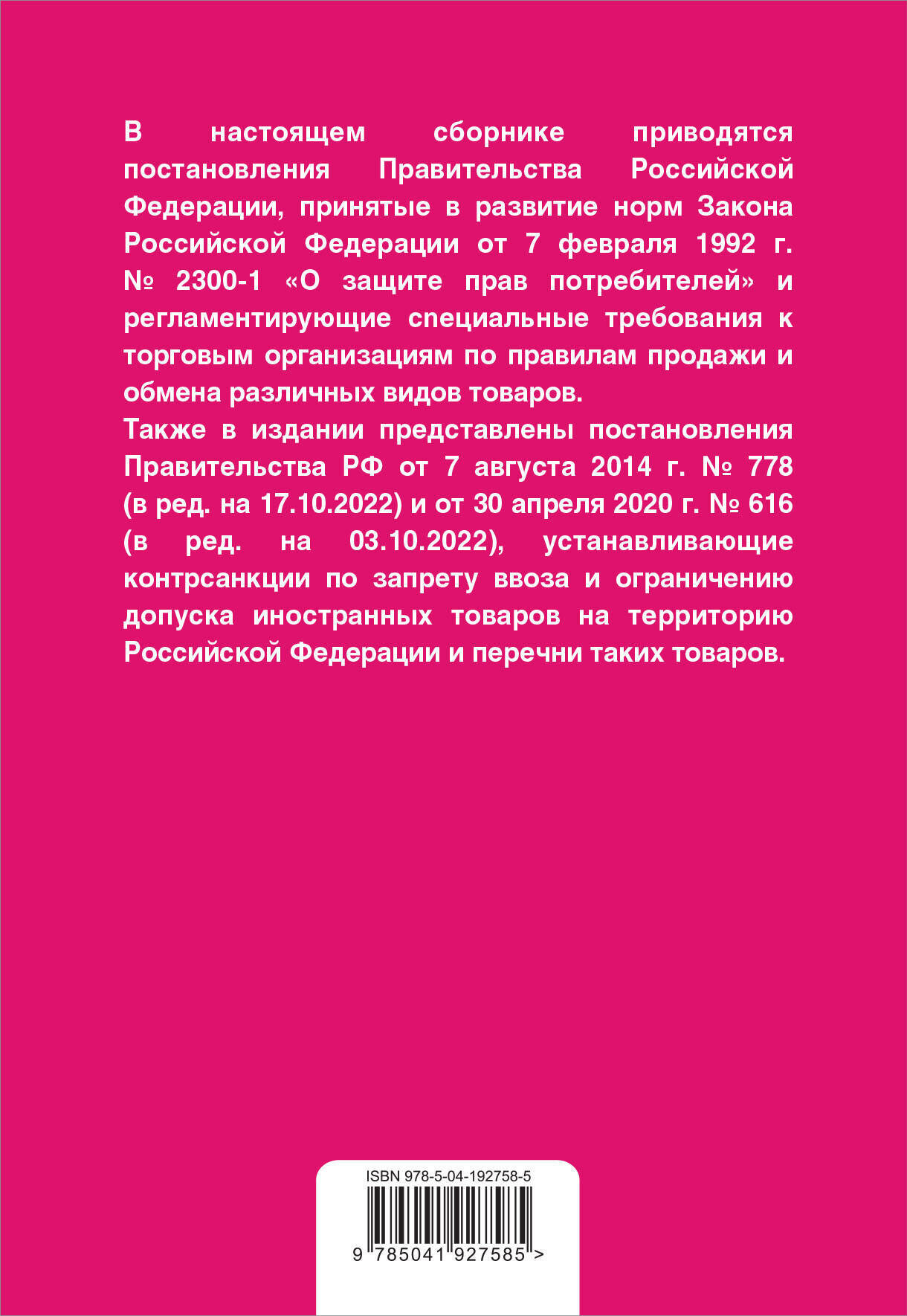 В настоящем сборнике приводятся шесть постановлений Правительства Российской Федерации, принятых в развитие норм Закона Российской Федерации от 7 февраля 1992 г. № 2300-I "О защите прав потребителей" и регламентирующих специальные требования к торговым организациям. Также в издании представлено постановление Правительства РФ от 7 августа 2014 г. № 778 "О мерах по реализации Указа Президента Российской Федерации от 6 августа 2014 г. № 560 "О применении отдельных специальных экономических мер в целях обеспечения безопасности Российской Федерации". Правила торговли могут относиться как к продаже любых товаров, так и отдельных их видов или групп. Например, Правила продажи отдельных видов товаров, утвержденные постановлением Правительства Российской Федерации от 19 января 1998 г. № 55. Помимо правил продажи видов товаров, существуют также специальные правила торговли для определенных видов торговых организаций (торговых операций), например: - Правила комиссионной торговли непродовольственными товарами, утвержденные постановлением Правительства Российской Федерации от 6 июня 1998 г. № 569; - Правила продажи товаров по образцам, утвержденные постановлением Правительства Российской Федерации от 21 июля 1997 г. № 918. Издание предназначено для бухгалтеров, аудиторов, работников налоговых и финансовых служб, студентов, аспирантов и преподавателей экономических и юридических вузов и колледжей, юристов и руководителей организаций. Книга также будет полезна всем, кто интересуется данным законодательством или использует его в процессе работы. "