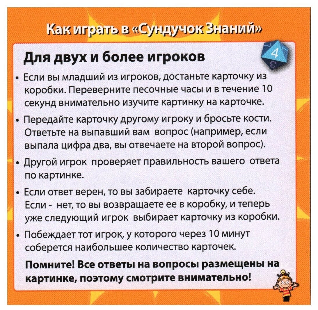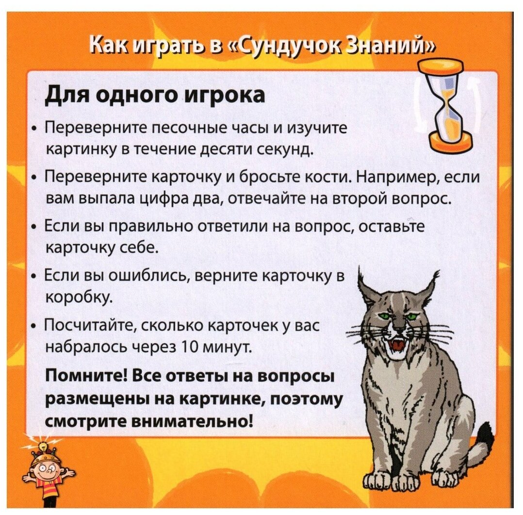 | Описание | 71 животных в одной коробке!,Спорим, вы даже не знали о существовании животного Трубкозуба? Онагр, гигантская выдра, сахарный планер тоже незнакомы для вас? А знали ли вы что лисицы бывают летучими? Все это можно узнать из карточек новой увлекательной игры для детей и взрослых «В мире животных».,С другой стороны, кто не слышал про царя зверей – льва, кто не восхищается быстротой гепардов, красотой лань, выносливостью верблюдов и силой слонов…Вы думаете, что вам известно все об этих животных? Начиная играть «В мире животных», понимаешь как много удивительных и интересных фактов мы не знаем. Тем более о них ничего не слышали дети. А в карточках игры они узнают много подробностей о том, где обитают те или иные животные, какая средняя продолжительность их жизни и всё самое интересное, необычное и захватывающее о любимых зверях.,Трудно найти детей, которые бы не любили животных. Подарите им сразу всю дикую природу!,,Как играть? ,,Для двух игроков:,Если вы младший из игроков, достаньте карточку. Переверните песочные часы и в течение 10 секунд внимательно изучите картинку на карточке.,Передайте карточку другому игроку и бросьте кости. Ответьте на выпавший вам вопрос.,Другой игрок проверяет правильность вашего ответа по картинке.,Если ответ верен, то вы забираете карточку себе. Если – нет, то вы возвращаете ее в коробку, и теперь уже следующий игрок выбирает карточку из коробки.,Побеждает тот игрок, у которого через 10 минут соберется наибольшее количество карточек.,,Для одного игрока:,Переверните песочные часы и изучите картинку в течение десяти секунд,Переверните карточку и бросьте кости.,Если Вы правильно ответили на вопрос, оставьте карточку себе, если нет – положите обратно в коробку. Посчитайте, сколько карточек у вас набралось через 10 минут.,,Результат |