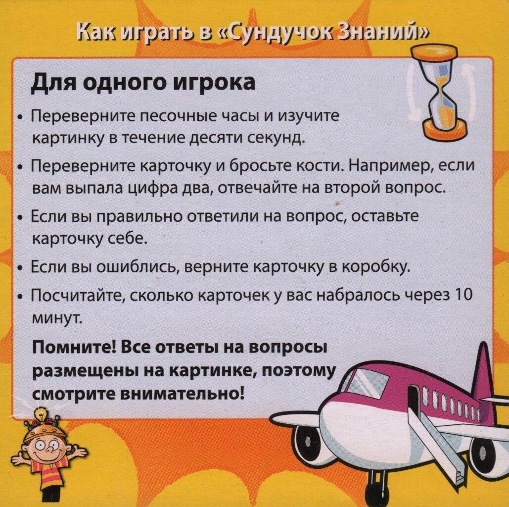 | Описание | Сундучок Знаний “Мои первые картинки”, созданный для самых маленьких игроков, поможет ребенку лучше распознавать предметы и животных, улучшит зрительную память и концентрацию внимания. Эта игра, состоящая из 55 красочно иллюстрированных карточек, способствует активному развитию вашего ребенка.,,Как играть?,,Для двух игроков:,Если вы младший из игроков, достаньте карточку. Переверните песочные часы и в течение 10 секунд внимательно изучите картинку на карточке.,Передайте карточку другому игроку и бросьте кости. Ответьте на выпавший вам вопрос.,Другой игрок проверяет правильность вашего ответа по картинке.,Если ответ верен, то вы забираете карточку себе. Если – нет, то вы возвращаете ее в коробку, и теперь уже следующий игрок выбирает карточку из коробки.,Побеждает тот игрок, у которого через 10 минут соберется наибольшее количество карточек.,,Для одного игрока:,Переверните песочные часы и изучите картинку в течение десяти секунд,Переверните карточку и бросьте кости.,Если Вы правильно ответили на вопрос, оставьте карточку себе, если нет – положите обратно в коробку. Посчитайте, сколько карточек у вас набралось через 10 минут.,,Результат |