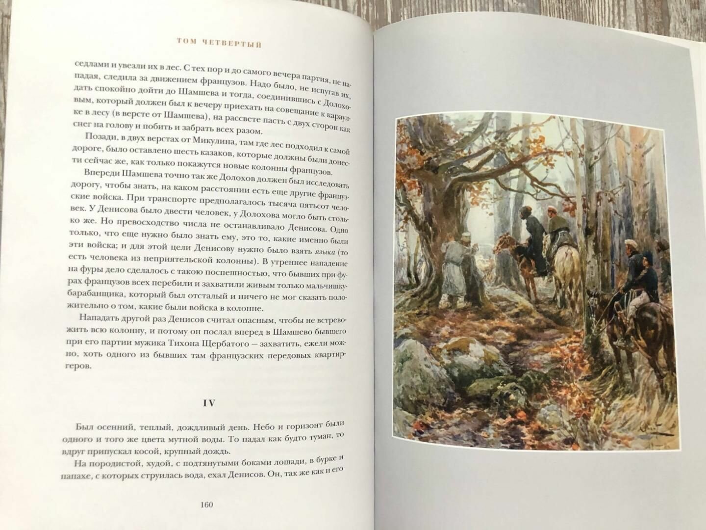 В художественном оформлении издания использованы иллюстрации ведущих российских и французских художников: В. Серова, А. Николаева, И. Архипова, К. Верне, А. Гро, Э. Детайля, Ф. Константа. Огромное количество иллюстраций, собранных впервые, многие из которых неизвестны читателям, позволяет подчеркнуть эпический характер произведения, наглядно продемонстрировать важнейшие исторические события того времени в видении как российских, так и французских художников, показать звездный час и падение Наполеона - этого символа войны, столь нелюбимого Толстым. Внешнее и внутреннее оформление книг не имеет себе равных из всех собраний великого мастера, когда - либо издававшихся не только в России, но и за рубежом. Сочетание трехстороннего золотого обреза с семицветным тиснением фольги на двух сторонках обложки и корешке придает изданию изысканный и роскошный вид.