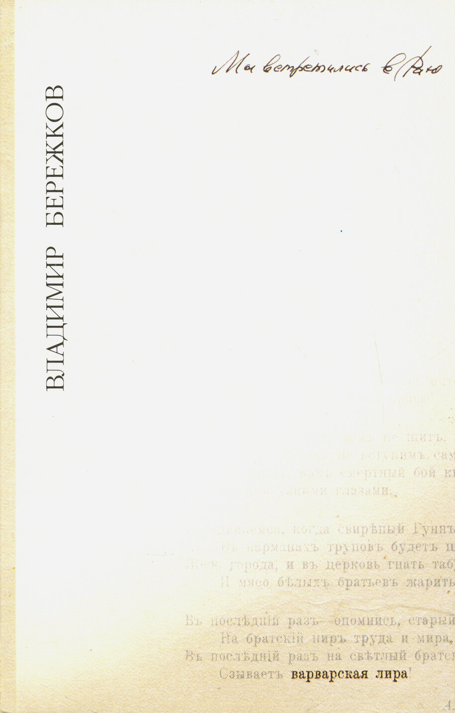 Книга стихотворений Владимира Бережкова - первая книга поэтической серии "Варварская лира", задача которой - включение изустной и зачастую поющейся поэзии в "естественный" литературный процесс. Стихи Владимира Бережкова, участника легендарного СМОГа, - это поэзия, обладающая совершенно неповторимым голосом и тембром. Еще Александр Галич говорил о Бережкове, что "он будет писать лучше всех нас".