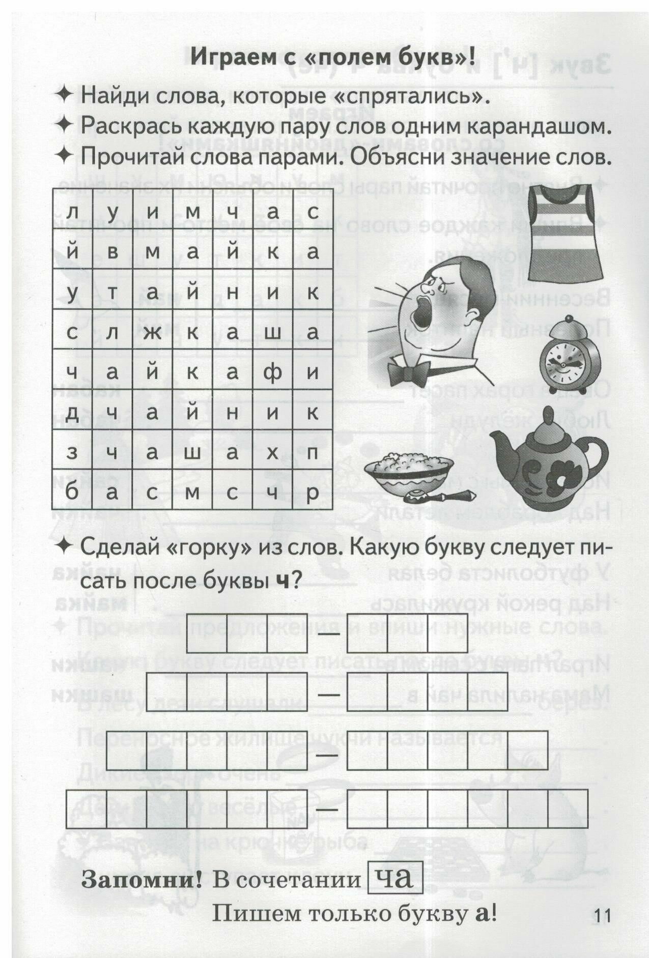 Уважаемые родители и педагоги! В русском языке есть три буквы - Ч (че), Щ (ща), Й (и краткое), которые обозначают непарные мягкие согласные звуки [Ч'], [Щ'], [Й'](знак ' в надстрочнике указывает на их мягкость). У этих звуков и букв есть свои правила произношения и написания. Мы предлагаем систему игровых упражнений с буквосочетаниями ЧА, ЩА, ЧУ, ЩУ и звуками [И], [Й']. Эти упражнения помогут усвоить связанные с ними правила. Упражнения построены на материале слов-паронимов - разных по смыслу, но близких по звучанию слов (например, тайник - чайник, судак - чудак, роза - роща, тучка - щучка, валун - валуй). Паронимы вызывают у детей живой интерес и поэтому служат благодатным материалом не только для развития фонематического слуха и концентрации внимания, но и для обогащения речевой деятельности. Тетрадь рассчитана на совместную работу родителей и детей.