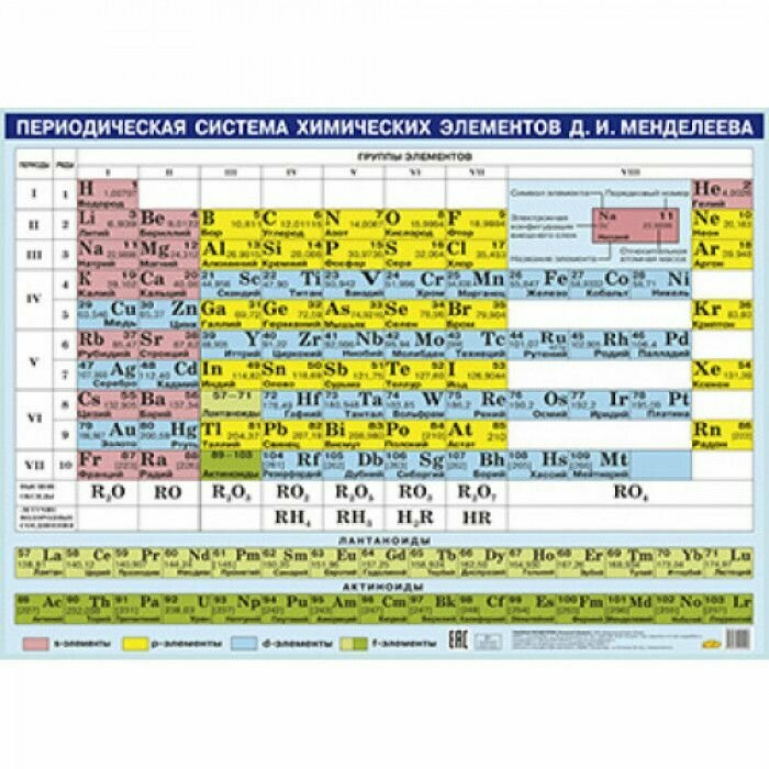 Учебный плакат "Периодическая система химических элементов Д. И. Менделеева", выполненный на плотном картоне.