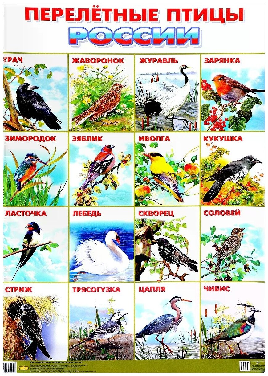 Обучающий плакат познакомит детей дошкольного и младшего школьного возраста с перелетными птицами России.