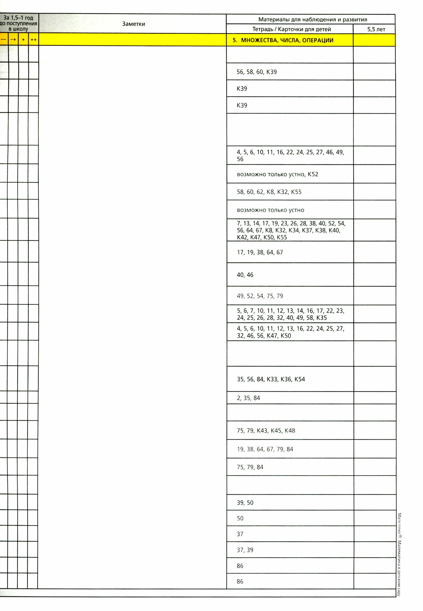 «Журнал наблюдений» входит в программно-дидактический комплект «Мате:плюс®. Математика в детском саду». Журнал предназначен для ведения наблюдений за развитием базовых умений и навыков дошкольника по всем разделам математики: - пространство и форма; - структуры, закономерности, узоры; - величины и измерения; - данные, частота, вероятность; - множества, числа, операции. В журнал входят три индивидуальные таблицы для ведения наблюдений, по одной для каждого возрастного периода: «3,5-5 лет», «4,5-6 лет» и «5,5-7 лет». Фиксация результатов наблюдений и диагностики в представленных таблицах позволит получить объективную картину уровня развития математических умений и навыков дошкольника и на этой основе организовать дальнейшую целенаправленную работу. Материалы «Мате:плюс®. Математика в детском саду» полностью соответствуют ФГОС ДО и могут использоваться в работе с детьми в дошкольных образовательных организациях, детских развивающих центрах и в рамках семейного образования.