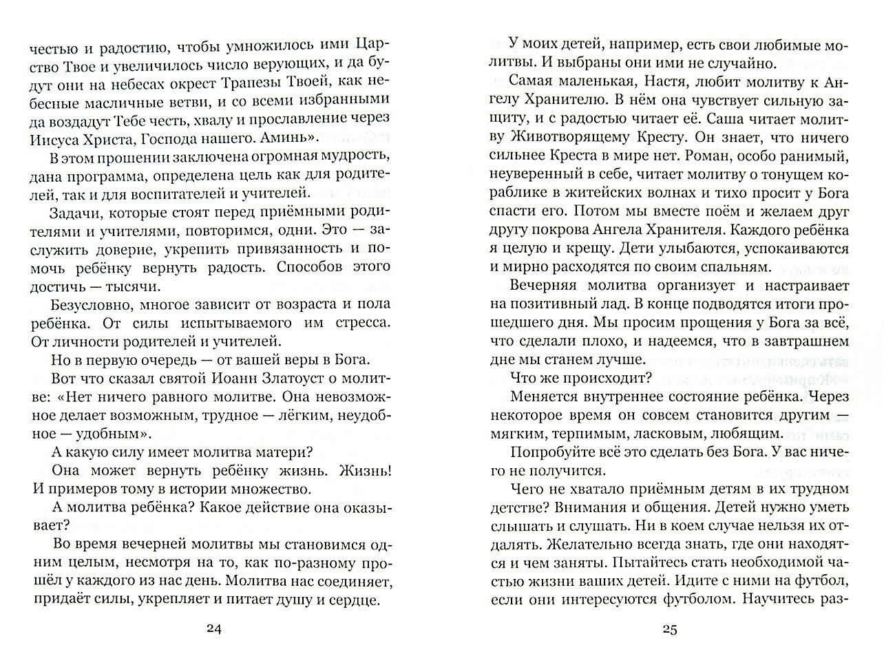 В этой книге Ирина Петровна Пятницкая раскрывает свой опыт и знания приемной матери: ".хочу поделиться, чтобы внести свою лепту в святое дело, со всеми - приемными родителями, опекунами, учителями, с теми, кто только собирается усыновить ребенка. И просто с семьями, где дети получили душевную травму - из-за недостатка внимания родителей, из-за разводов, пьянства, лжи, измен, жестокого обращения, ранних браков". Ведь, по мысли автора, такие дети словно вернулись с жестокой войны, и для их исцеления потребуются вера, терпение, знания и любовь. Книга помогает найти решение актуальных для многих проблем: почему так трудно быть приемным родителем, как работать учителю с "трудными" детьми, а также рассказывает, как воспитание детей в православной вере помогает облегчить возникающие трудности. Допущено к распространению Издательским Советом Русской Православной Церкви.