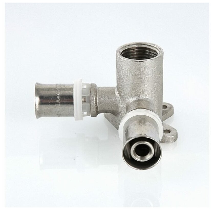 - Угловой пресс-фитинг-тройник с креплением (проходная водорозетка) предназначен для присоединения к металлопластиковым (металлополимерным) трубам и трубам из сшитого полиэтилена элемента системы, имеющего наружную резьбу. Резьба фитинга – внутренняя трубная по ГОСТу 6357.