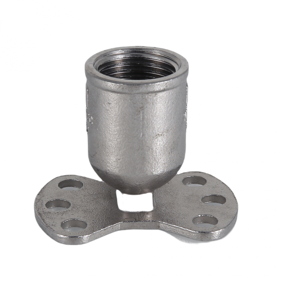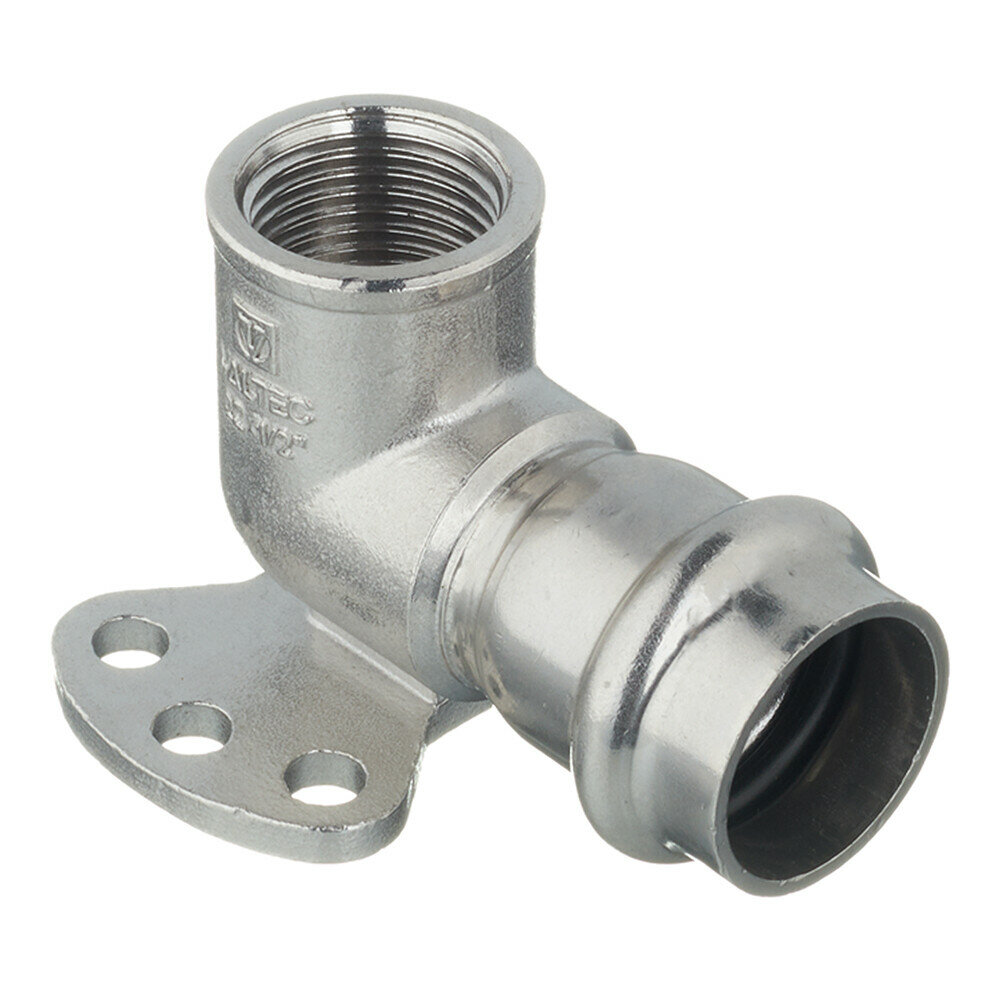 - Пресс-угольник из нержавеющей стали с переходом на внутреннюю резьбу и креплением (водорозетка) обеспечивает соединение тонкостенной стальной трубы с резьбовым элементом (в частности, патрубком сантехнического смесителя) монтируемой системы под углом 90°.