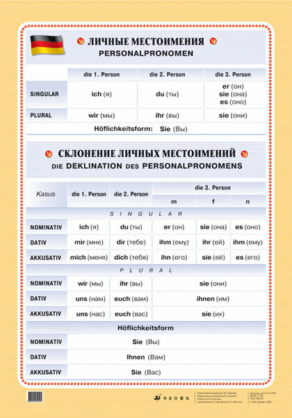 Плакат: Немецкий язык. Личные местоимения. Притяжательные местоимения (Шмакова Е. Ю.); Просвещение/Дрофа, 2003