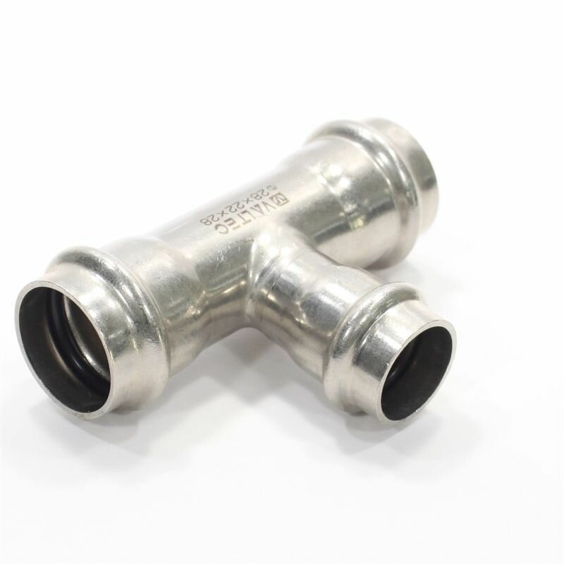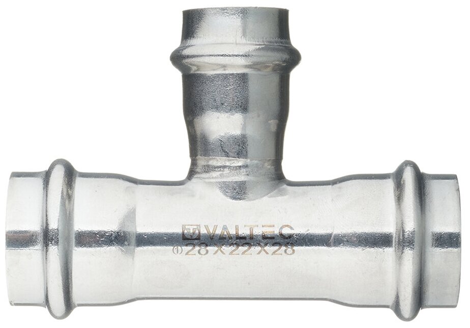 Трехраструбный пресс-тройник из нержавеющей стали обеспечивает соединение трех тонкостенных стальных труб систем водоснабжения, отопления, иных инженерных и технологических установок с рабочей температурой до 95 °С и давлением до 16 бар. Изделие изготовлено из стали AISI 304. Материал уплотнительных колец – эластомер EPDM Sh70. Благодаря бесштуцерной конструкции соединитель обладает малым коэффициентом местного сопротивления – сужение канала практически отсутствует. Фитинг рассчитан на обжатие с помощью пресс-инструмента V-профиля.