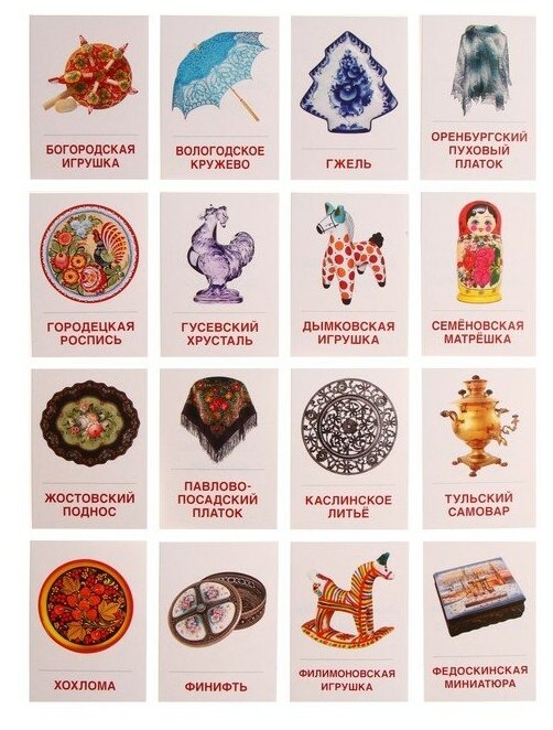 16 раздаточных карточек с текстом. Формат: 63х87 мм. В комплекте карточки: Богородская игрушка Вологодское кружево Гжель Городецкая роспись Гусевский хрусталь Дымковская игрушка Жостовский поднос Каслинское литье Оренбургский пуховый платок Павловопосадский платок Семеновская матрешка Тульский самовар Федоскинская миниатюра Филимоновская игрушка Финифть Хохлома Сделано в России.