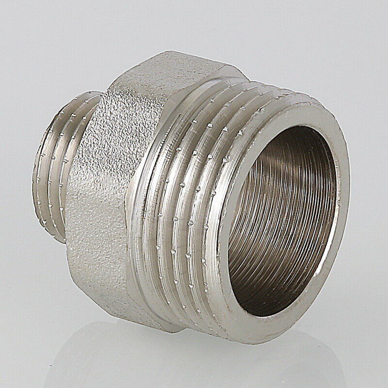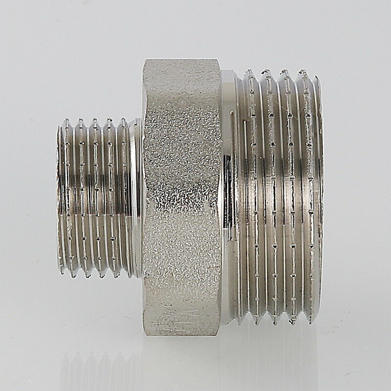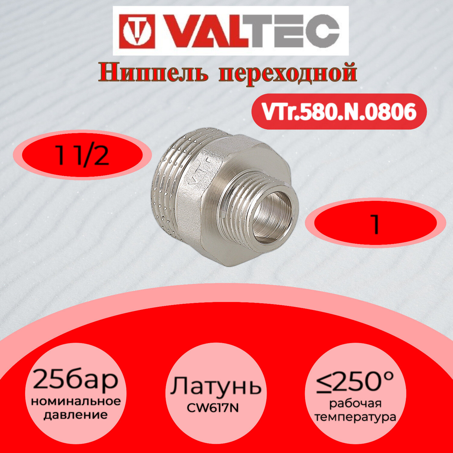 **Ниппель переходной Valtec** — разновидность фитинга с наружной резьбой, который предназначен для соединения трубопроводов (вода, отопление, газ и др.) разного диаметра — 1,1/2" × 1". Изготовлен из латуни путем горячего штампования с последующим никелированием.