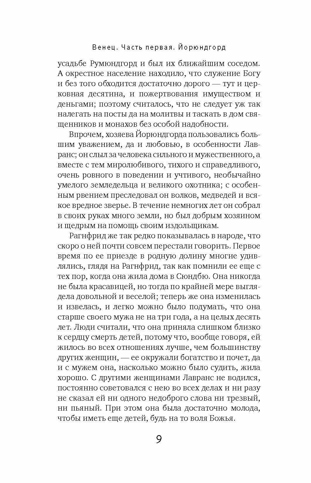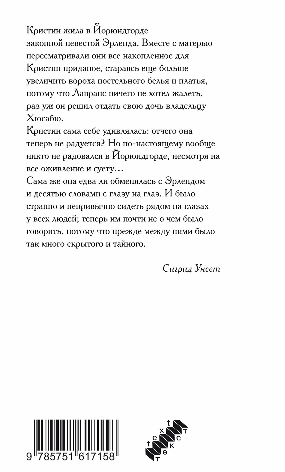 Норвежская писательница Сигрид Унсет (1882-1949) была удостоена Нобелевской премии по литературе с формулировкой "за совершенное изображение норвежского средневековья". Действие исторической трилогии "Кристин, дочь Лавранса" происходит в средневековой Норвегии. В центре повествования история жизни Кристин, дочери уважаемого и состоятельного хозяина усадьбы Йорюндгорд, связавшей судьбу с легкомысленным рыцарем Эрлендом. Это история о любви и верности, и той высокой цене, что порой приходится платить за исполнение желаний. В книгу вошла первая часть трилогии под названием "Венец" (1920). В ней рассказывается о детстве и взрослении Кристин, ее семье, а также о внезапно вспыхнувшей страсти к рыцарю Эрленду, которому суждено сыграть роковую роль в ее жизни. Кристин жила в Йорюндгорде законной невестой Эрленда. Вместе с матерью пересматривали они все накопленное для Кристин приданое, стараясь еще больше увеличить вороха постельного белья и платья, потому что Лавранс ничего не хотел жалеть, раз уж он решил отдать свою дочь владельцу Хюсабю. Кристин сама себе удивлялась: отчего она теперь не радуется? Но по-настоящему вообще никто не радовался в Йорюндгорде, несмотря на все оживление и суету. Сама же она едва ли обменялась с Эрлендом и десятью словами с глазу на глаз. И было странно и непривычно сидеть рядом на глазах у всех людей; теперь им почти не о чем было говорить, потому что прежде между ними было так много скрытого и тайного. Сигрид Унсет