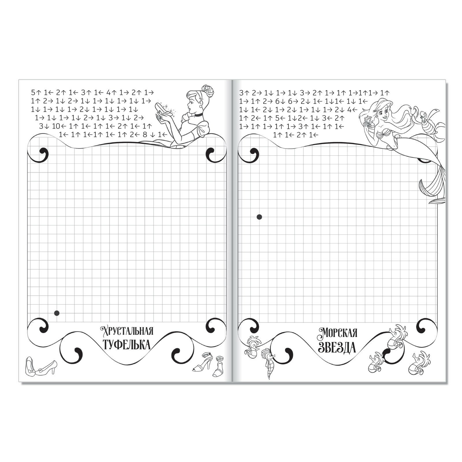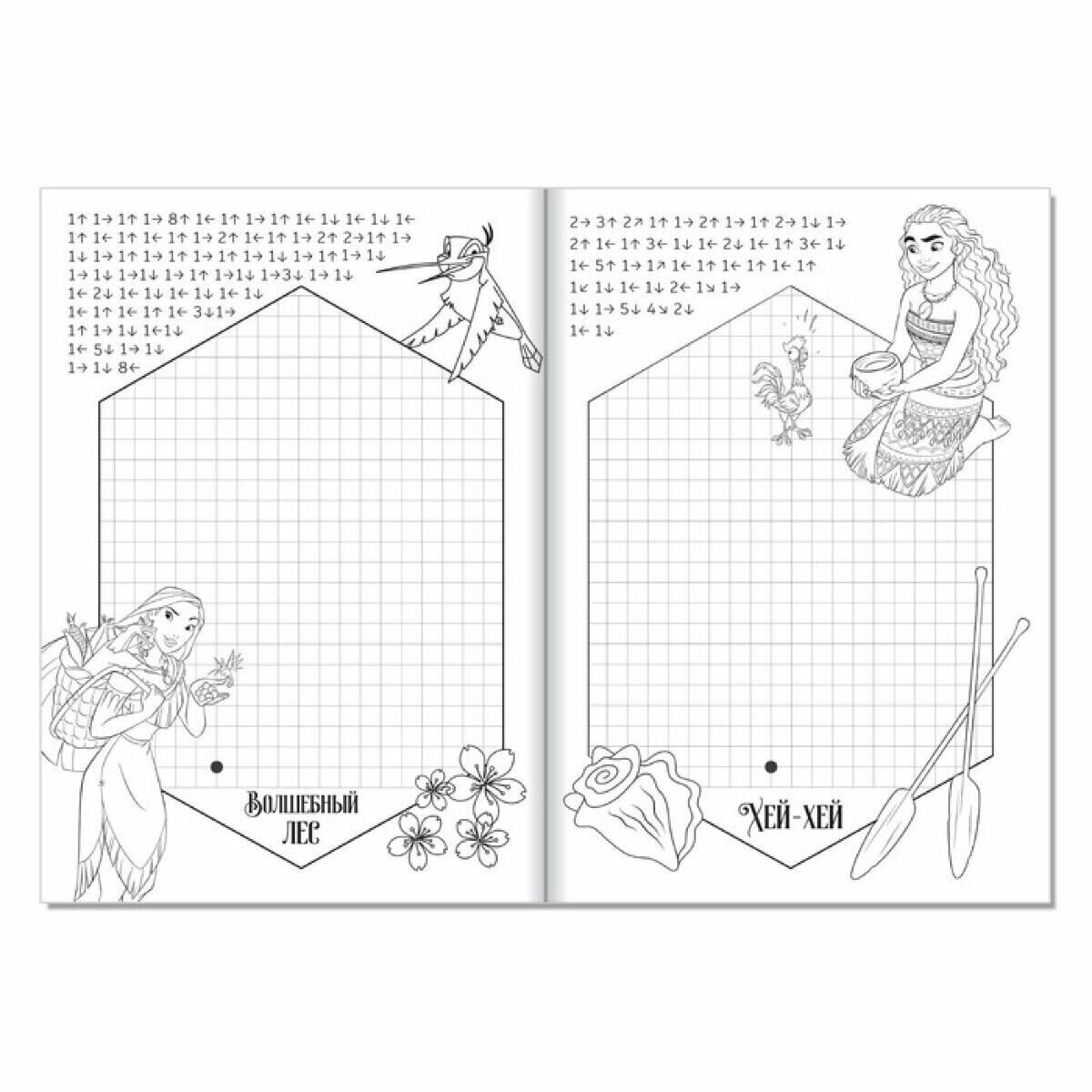 Любимые принцессы стали героинями графических диктантов. Соедини клеточки по схемам и нарисуй картинки, которые они тебе загадали!