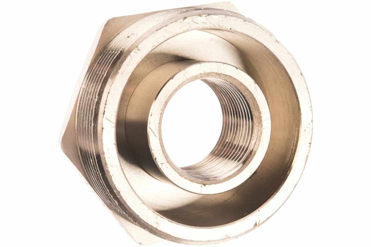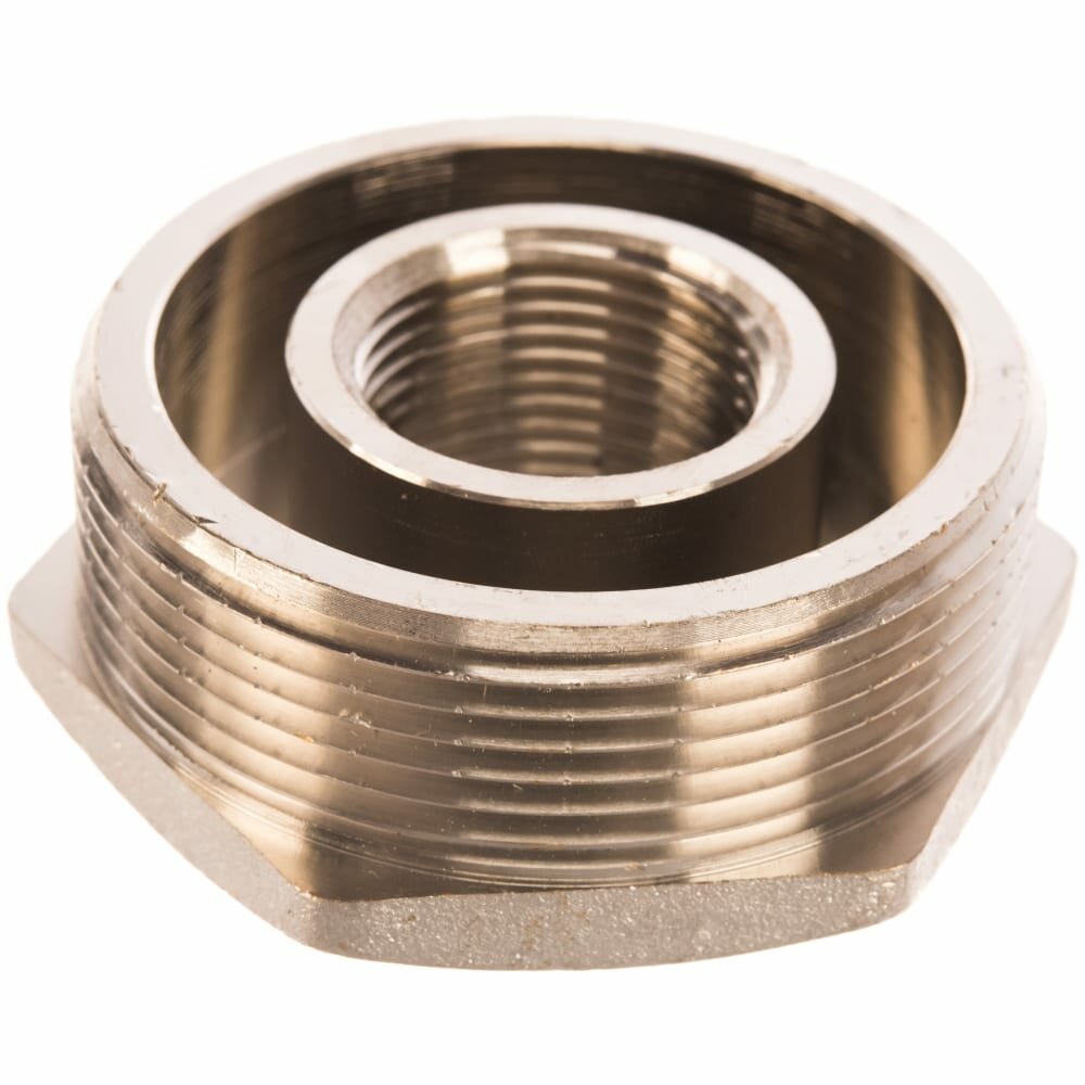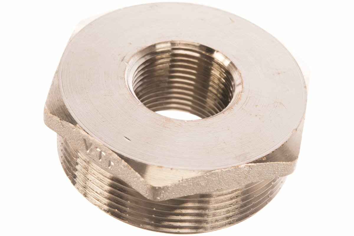 Футорка – фитинг, обеспечивающий соединение труб разного типоразмера, подключение трубопровода к элементу системы с большим диаметром присоединительного патрубка, ремонт (замену) поврежденной резьбы. Изделие выполнено из латуни марки CW617N, никелировано. Резьба – наружная/внутренняя, по типу – трубная цилиндрическая, совместимая с наружной конической (ГОСТ 6211). Шестигранная головка футорки служит ее вкручиванию гаечным ключом. Максимальное рабочее давление использования соединителя зависит от температуры среды