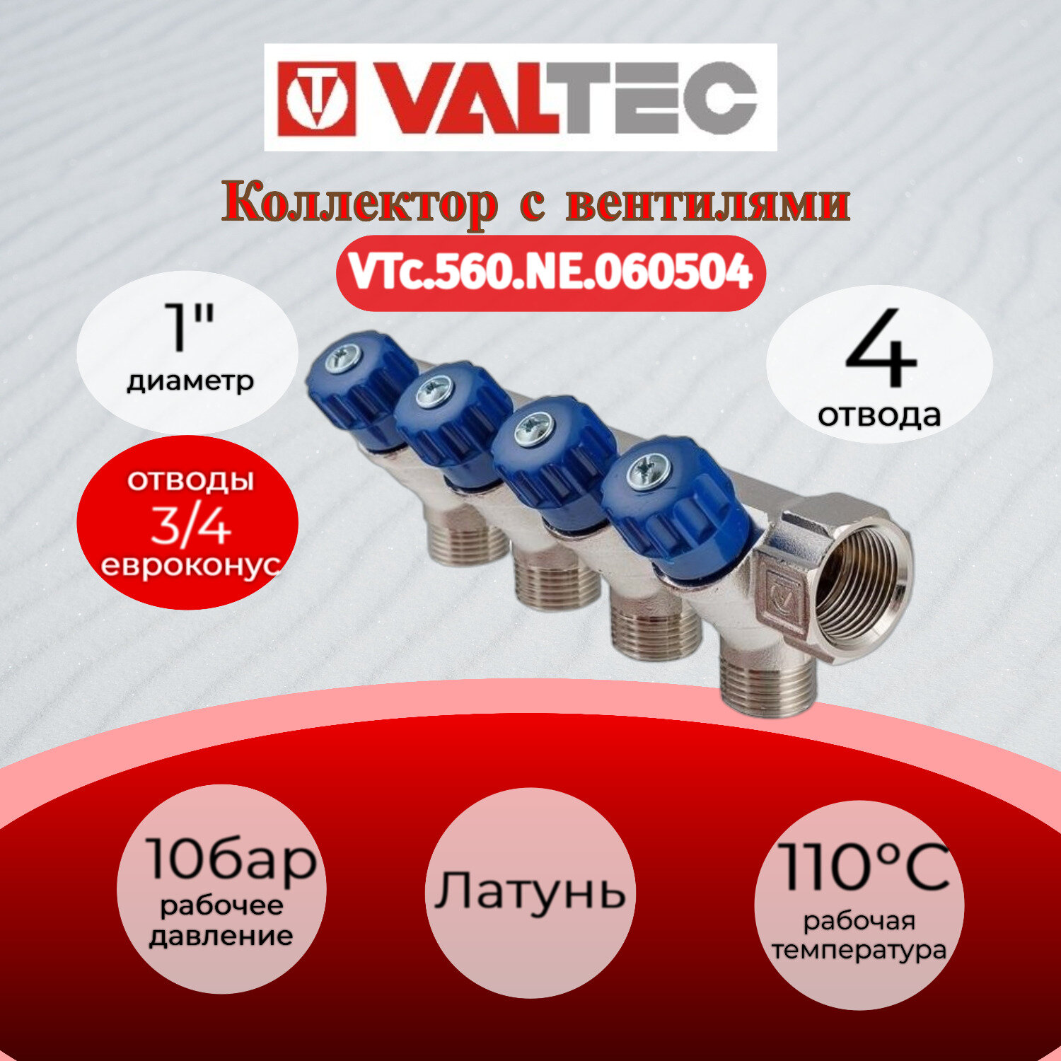 Сервис сравнения цен СкидкаГИД предлагает сравнить цены на товар «Коллектор Valtec с регулирующими вентилями и комплектом ручек 1" x 3/4" на 4 отвода VTc.560.NE.060504»