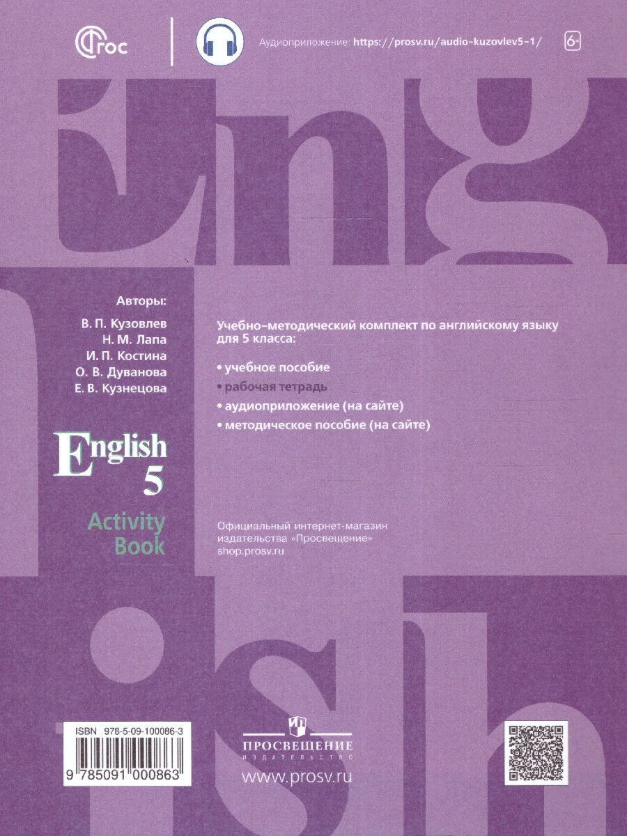 Рабочая тетрадь является составным компонентом УМК "Английский язык" для 5 класса общеобразовательных организаций и предназначена для активизации и закрепления лексико-грамматического материала. Ее содержание разбито на циклы, каждый из которых соотносится с соответствующим циклом основного учебного пособия. Рабочая тетрадь может использоваться учащимися как на уроке, так и для самостоятельных занятий дома. Содержание рабочей тетради соответствует требованиям Федерального государственного образовательного стандарта основного общего образования. Аудиоприложение доступно на сайте издательства Просвещения. 13-е издание, переработанное.