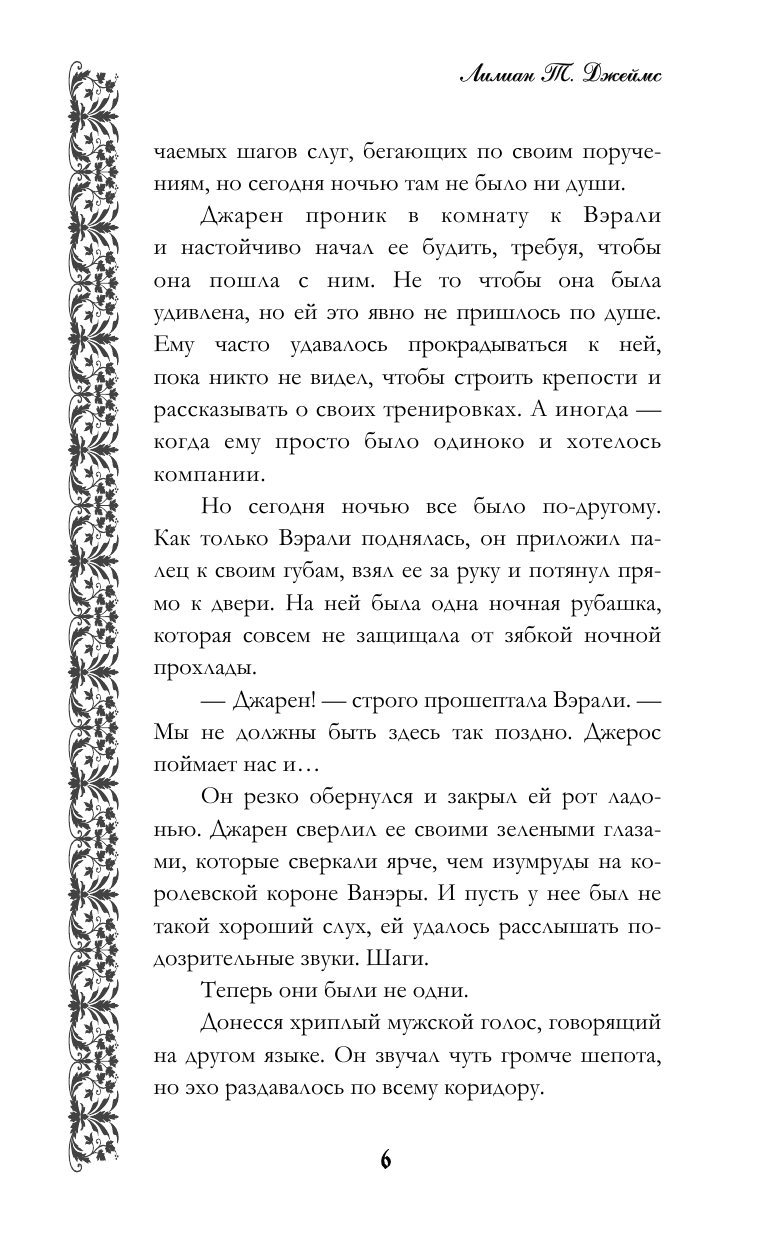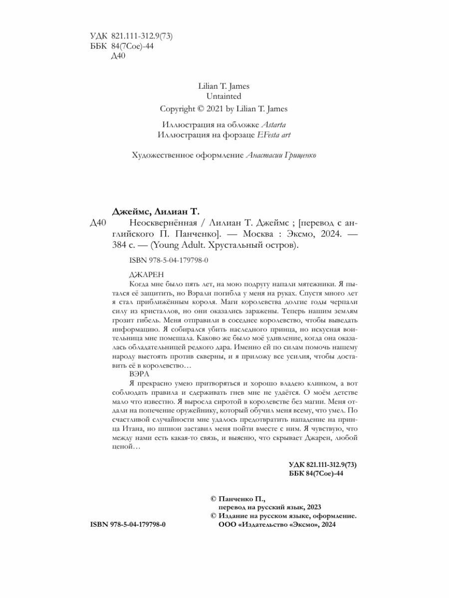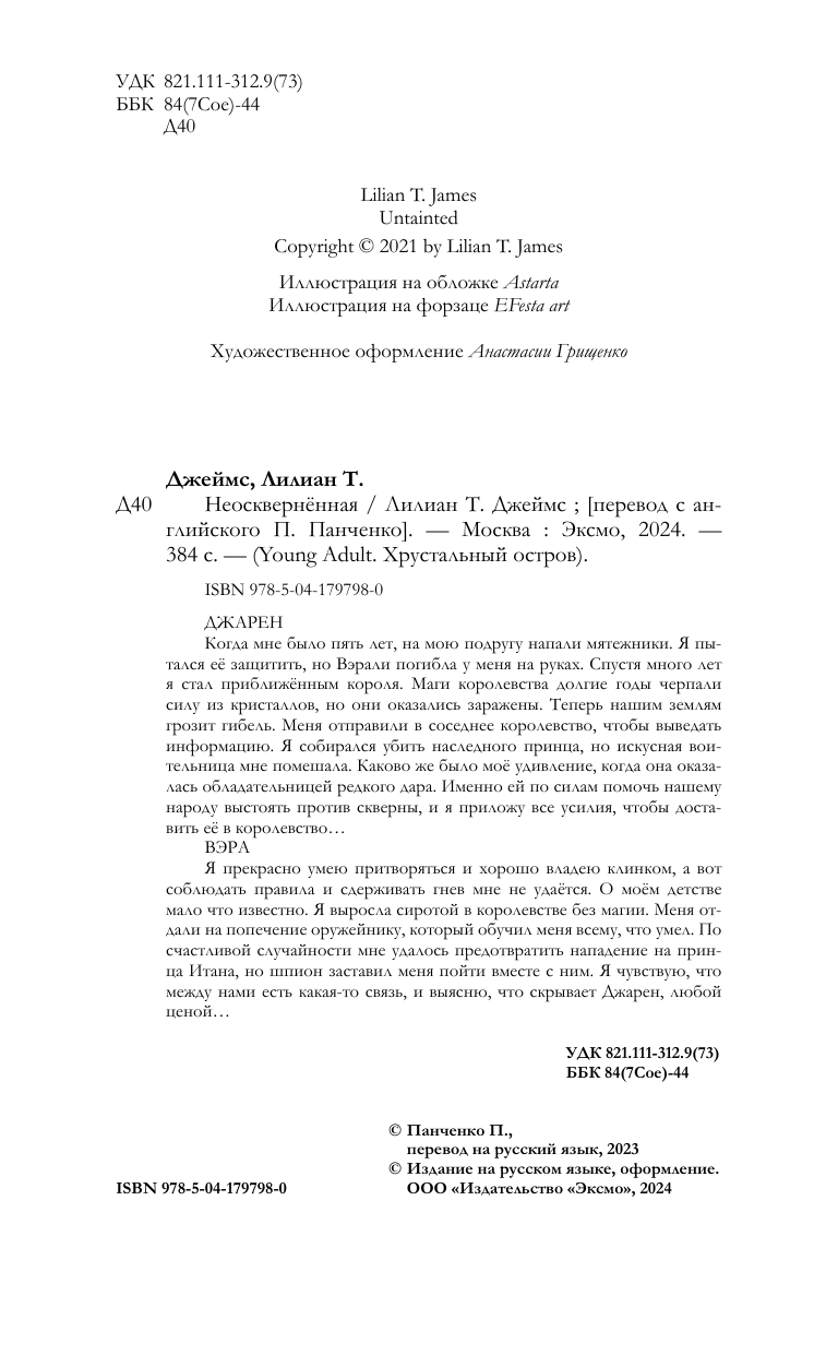 Первая книга молодежной фэнтези-серии «Хрустальный остров» от Лилиан Т. Джеймс! Невероятно яркая романтичная история с магией, слоуберном, тайнами прошлого и тропом «от ненависти до любви»! Повествование от лица нескольких персонажей позволит вам лучше погрузиться в историю! Увлекательное чтение для всех любителей романтики, а также фанатов Л. Дж. Эндрюс, Сары Маас и Рейвен Кеннеди! ДЖАРЕН Когда мне было пять лет, на мою подругу напали мятежники. Я пытался ее защитить, но Вэрали погибла у меня на руках. Спустя много лет я стал приближенным короля. Маги королевства долгие годы черпали силу из кристаллов, но они оказались заражены. Теперь нашим землям грозит гибель. Меня отправили в соседнее королевство, чтобы выведать информацию. Я собирался убить наследного принца, но искусная воительница мне помешала. Каково же было мое удивление, когда она оказалась обладательницей редкого дара. Именно ей по силам помочь нашему народу выстоять против скверны, и я приложу все усилия, чтобы доставить ее в королевство. ВЭРА Я прекрасно умею притворяться и хорошо владею клинком, а вот соблюдать правила и сдерживать гнев мне не удается. О моем детстве мало что известно. Я выросла сиротой в королевстве без магии. Меня отдали на попечение оружейнику, который обучил меня всему, что умел. По счастливой случайности мне удалось предотвратить нападение на принца Итана, но шпион заставил меня пойти вместе с ним. Я чувствую, что между нами есть какая-то связь, и выясню, что скрывает Джарен, любой ценой.
