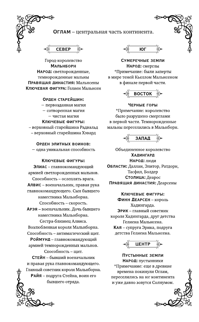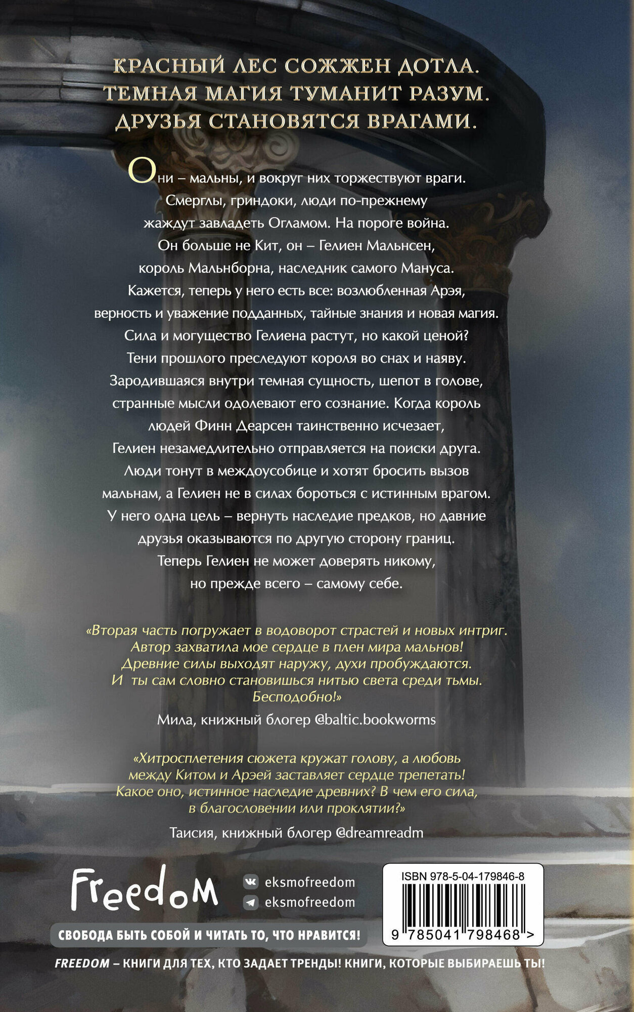 Продолжение уникального эпического фэнтези о магическом народе, скрывающемся в Северном лесу, от российской писательницы Миры Салье. Специально для тех, кто обожает масштабные миры, сражения, темную магию, а также любителям грандиозного фэнтези с народами, воюющими против зла и темных сил, в духе Виктории Авеярд, Лии Арден и фильмов Питера Джексона! Теперь Кит - темный король Мальнборна, Гелиен Мальнсен, наследник древнего правителя Мануса. В его руках власть и могущество, мощная магическая сила, а рядом - возлюбленная невеста Арэя. Но тени прошлого преследуют короля во снах и наяву. Темная сущность, шепот в голове, странные мысли одолевают его сознание. Когда король людей, Финн Деарсен, таинственно исчезает, Гелиен незамедлительно отправляется на поиски друга. Междоусобица среди людского народа - настоящая угроза для Мальнборна, а Гелиен чувствует себя ослабленным, не способным противостоять истинному врагу. Он жаждет вернуть наследие предков, но боится доверять даже самому себе. Цикл кинематографичен, словно фильм: открывая страницы, вы сразу попадаете в магический Оглам с несколькими королевствами: Хадингард, Тасфил, Даллан, Болдер, Мальнборн. В последнем живет уникальный народ мальнов, давней войной разделенный на светлых и темных. Тени, Сумеречные земли, смерглы - в Огламе рушится завеса между двумя мирами, обрушивая хаос на плечи всех, кто борется за свет! Сможет ли Гелиен спасти свое королевство от зла, не потеряв рассудок и Арэю, любовь всей своей жизни? Потрясающее оформление: цветные форзацы, подробная карта мира и глоссарий!