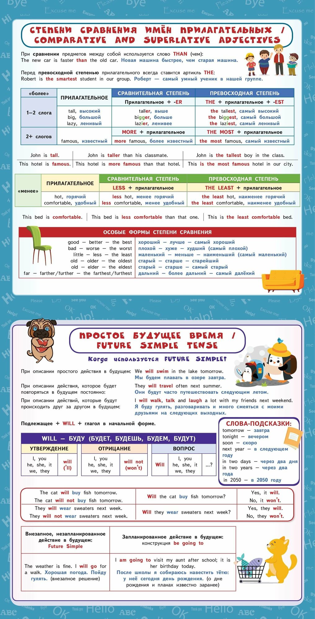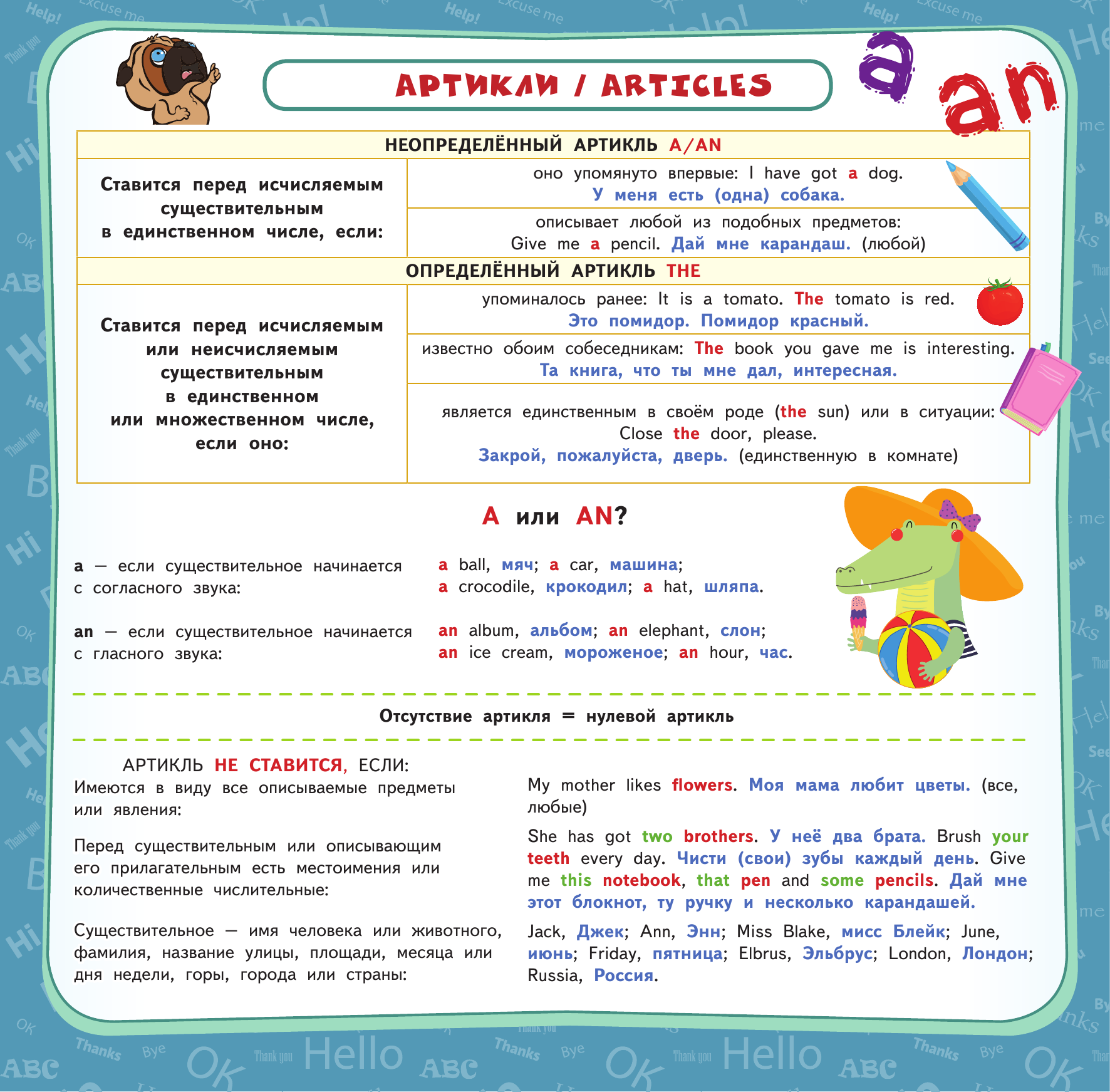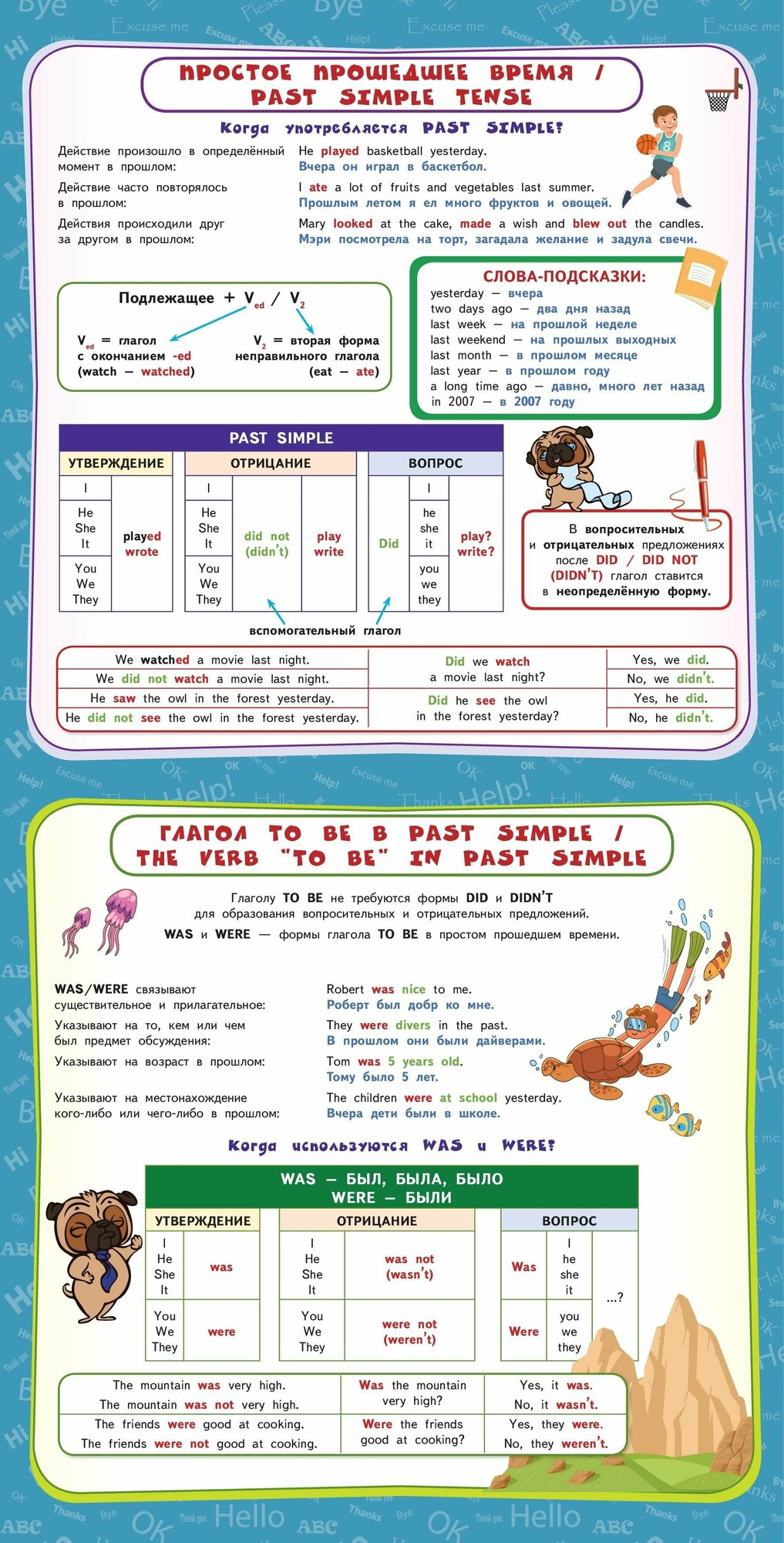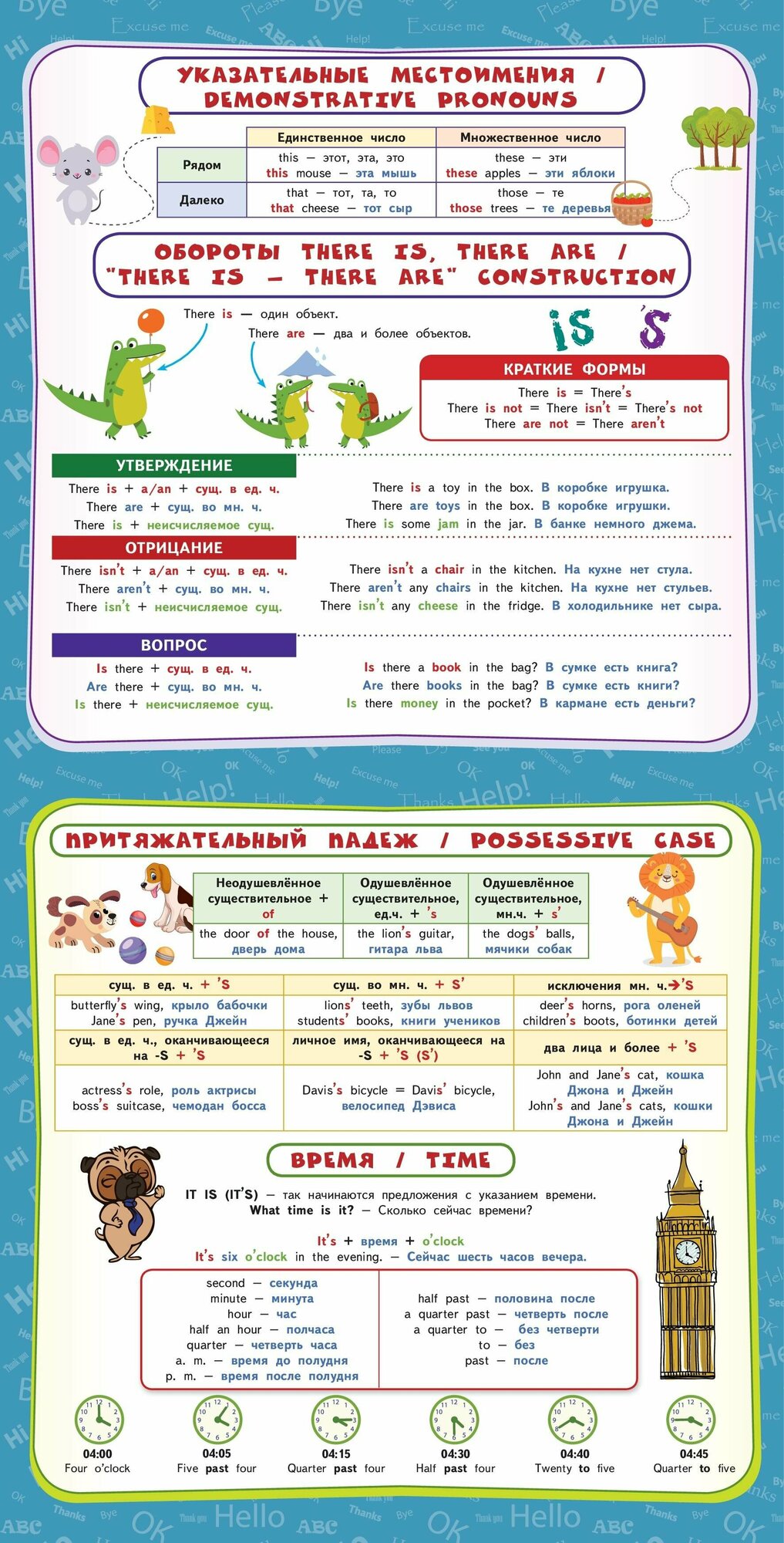 В пособии собраны все основные правила по английскому языку за курс начальной школы. Основная цель альбома-плаката - повторение и закрепление знаний, полученных на уроках английского языка. Учебный материал изложен наглядно и доступно, с применением схем и таблиц, и красочно проиллюстрирован. Благодаря этому правила и примеры их применения на практике будут легко усваиваться. Порядок тем соответствует школьной программе. Плакаты можно использовать как дома, так и в школе для лучшего усвоения и повторения учебного материала.