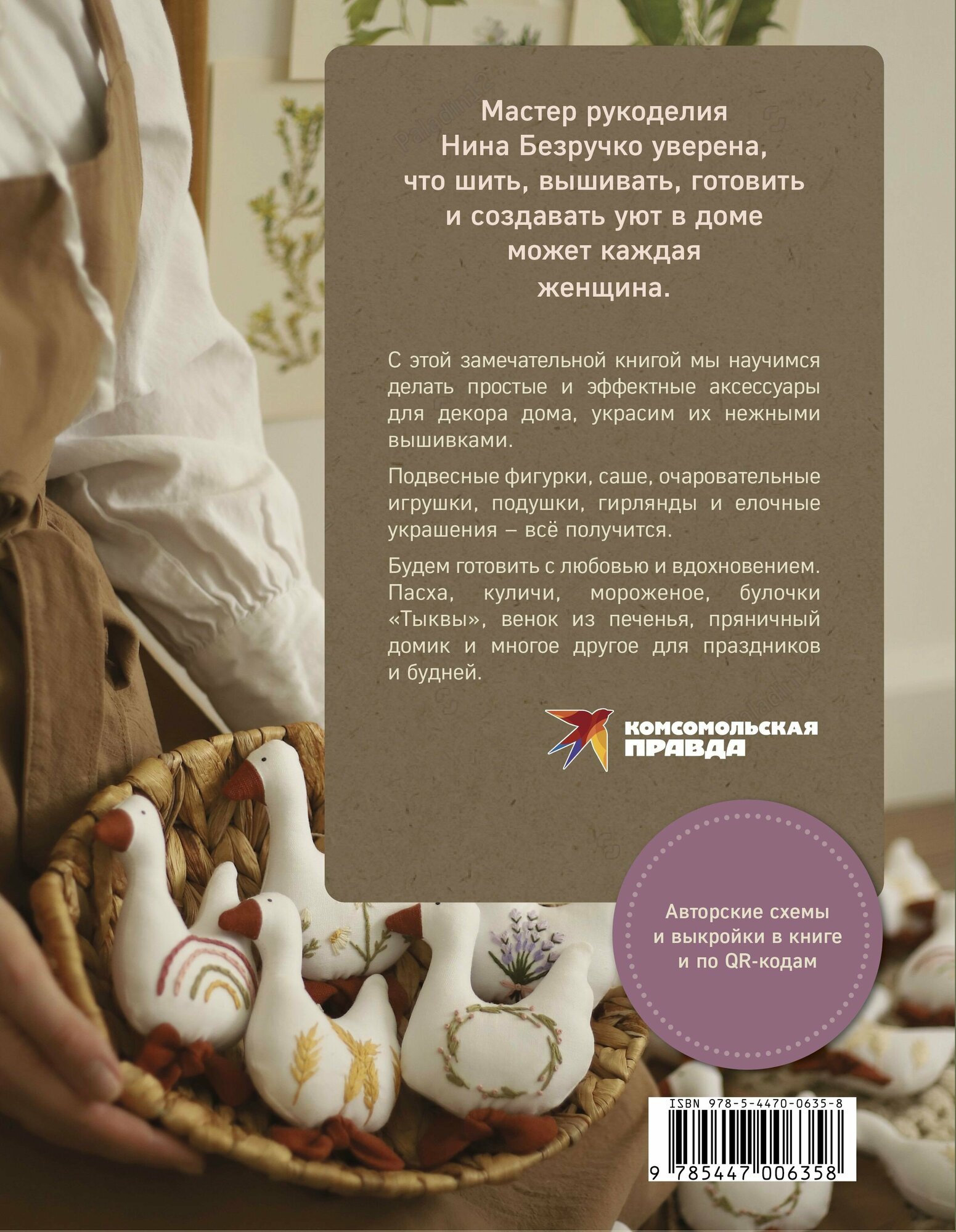 Мастер рукоделия Нина Безручко уверена, что шить, вышивать, готовить и создавать уют в доме может каждая женщина. С этой замечательной книгой мы научимся делать простые и эффектные аксессуары для декора дома, украсим их нежными вышивками. Подвесные фигурки, саше, очаровательные игрушки, подушки, гирлянды и елочные украшения - все получится. Будем готовить с любовью и вдохновением. Пасха, куличи, мороженое, булочки "Тыквы", венок из печенья, пряничный домик и многое другое для праздников и будней.