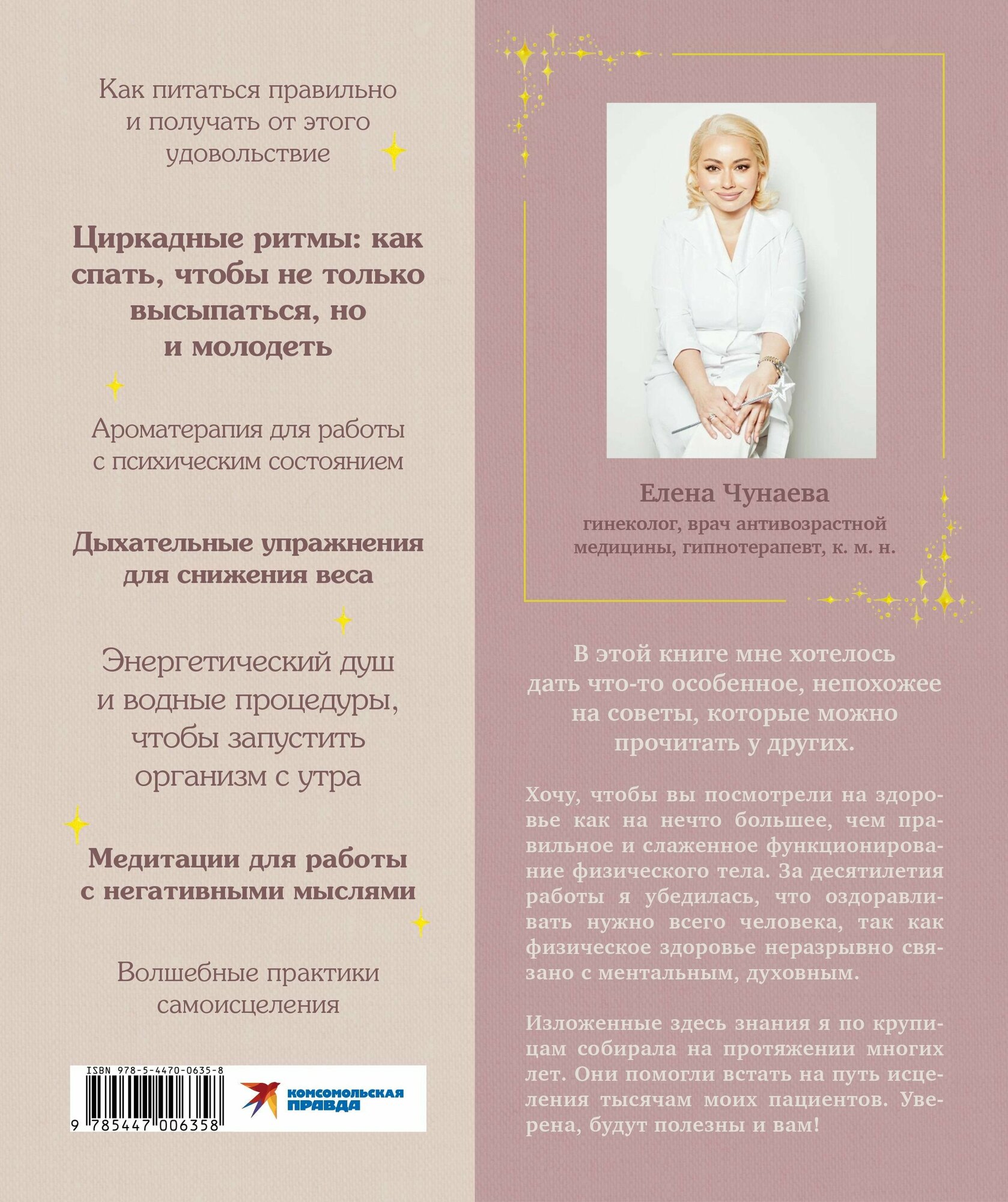 Когда врачи разводят руками и годами не могут поставить диагноз, а вас продолжают беспокоить жалобы (апатия, нет сил по утрам, приступы усталости, постоянные ОРВИ и простуды, бессонница, мигрени, озноб и потливость, вас не покидает чувство тревоги и случаются панические атаки, скачет вес и не помогают диеты) знайте: выход существует! Доктор Чунаева помогла тысячам пациентам, которые уже не верили в исцеление. Признаем, некоторые советы, изложенные в книге, базируются на допущениях и не имеют серьезных доказательств, но именно они помогли. «Никоим образом не умаляя ценности современных достижений медицины и, конечно же, следуя в своей практике многим из них, я пришла к выводу, что исцеление человеческого тела невозможно без исцеления души», - говорит автор, кандидат медицинских наук, гинеколог, врач антивозрастной медицины, гипнотерапевт. В книге вы найдете много практических рекомендаций, которые позволят чувствовать себя лучше и энергичнее каждый день: утренние ритуалы, чтобы запустить организм; дыхательные упражнения для хорошего самочувствия, снижения веса и профилактики заболеваний; медитации для работы с негативными мыслями и стрессом; письменные задания, чтобы лучше узнать себя и свой организм». Эта книга принесет колоссальную пользу каждому.