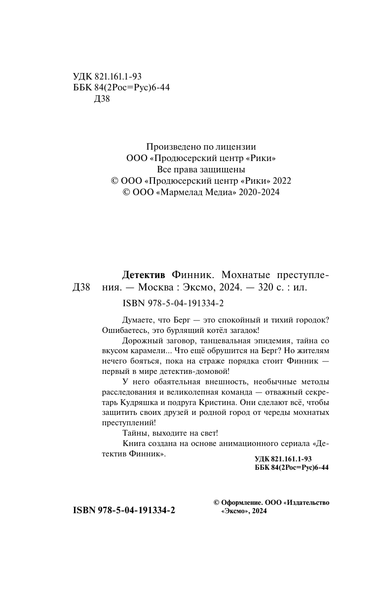 Думаете, что Берг - это спокойный и тихий городок? Ошибаетесь, это бурлящий котел загадок! Дорожный заговор, танцевальная эпидемия, тайна со вкусом карамели. Что еще обрушится на Берг? Но жителям нечего бояться, пока на страже порядка стоит Финник - первый в мире детектив-домовой! У него обаятельная внешность, необычные методы расследования и великолепная команда - отважный секретарь Кудряшка и подруга Кристина. Они сделают все, чтобы защитить своих друзей и родной город от череды мохнатых преступлений! Тайны, выходите на свет! Книга создана на основе анимационного сериала "Детектив Финник"