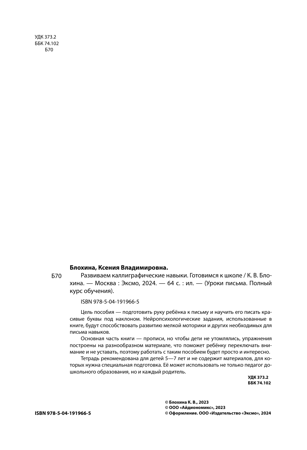 Развиваем каллиграфические навыки. Готовимся к школе (Блохина Ксения Владимировна); ООО "Издательство "Эксмо", 2024