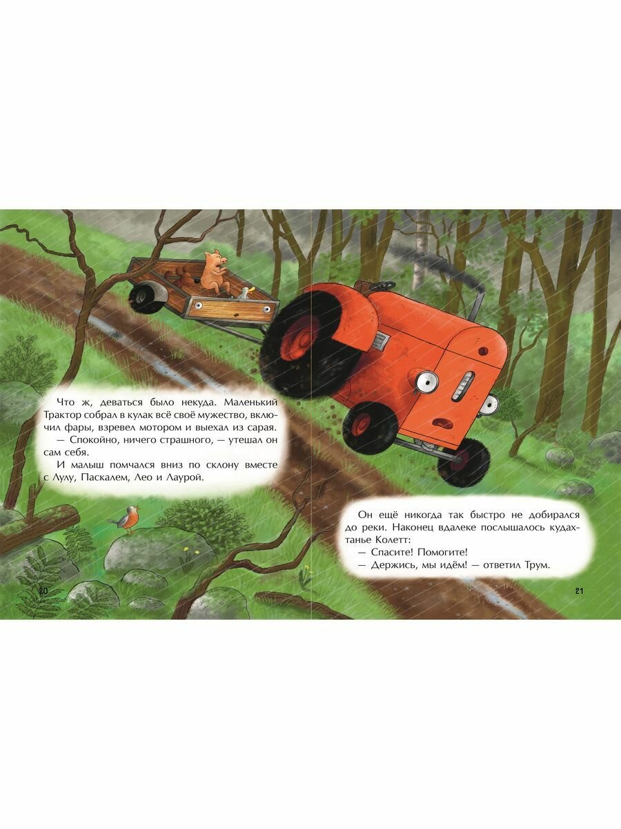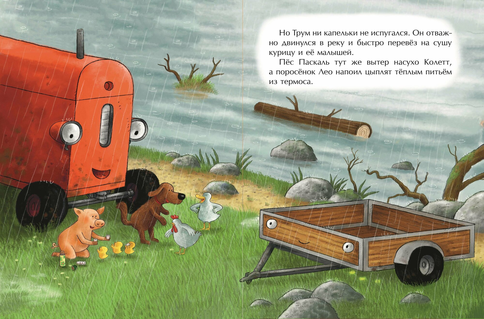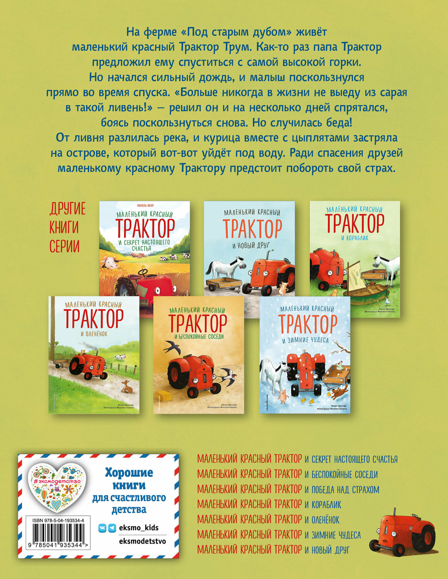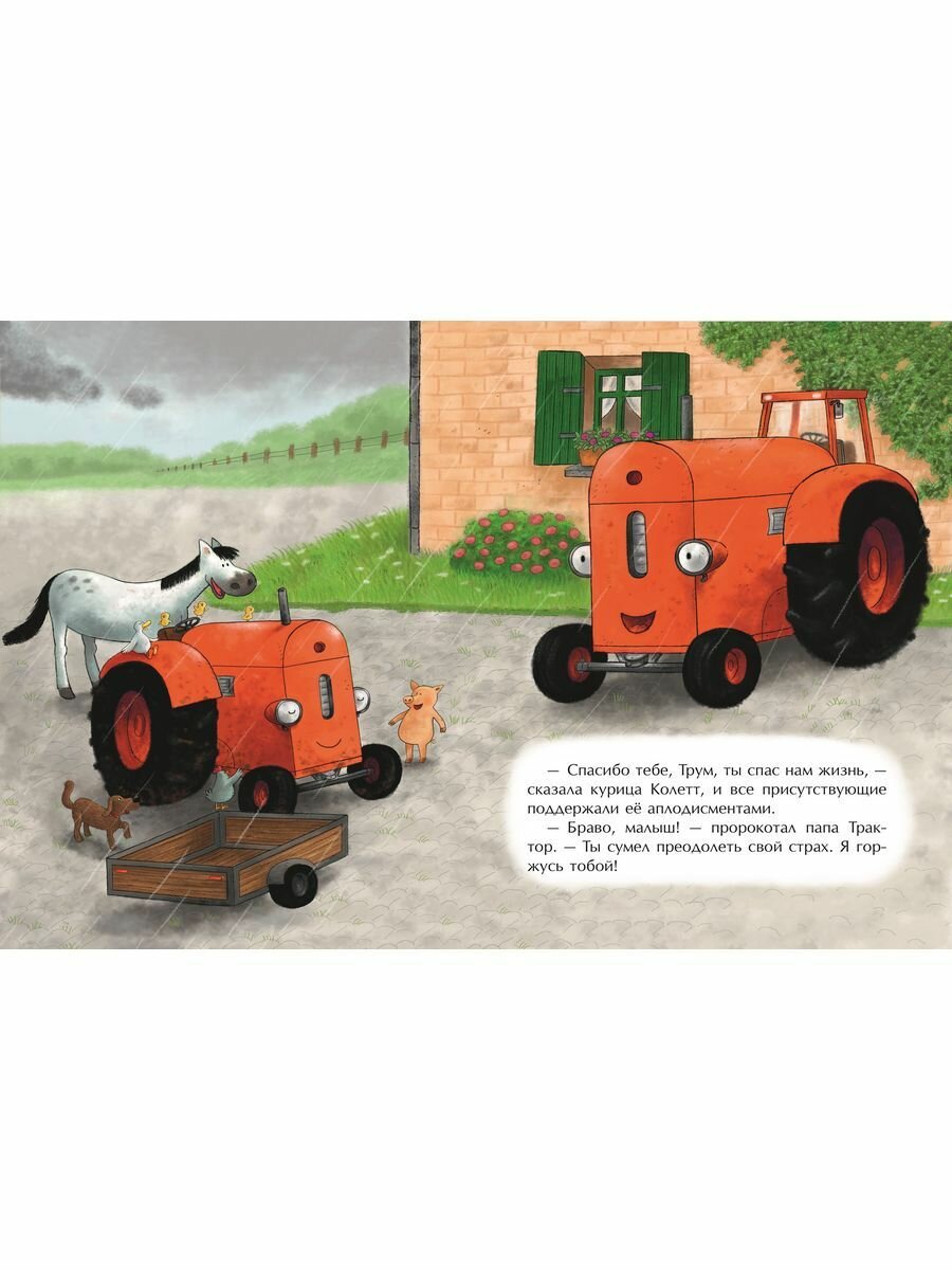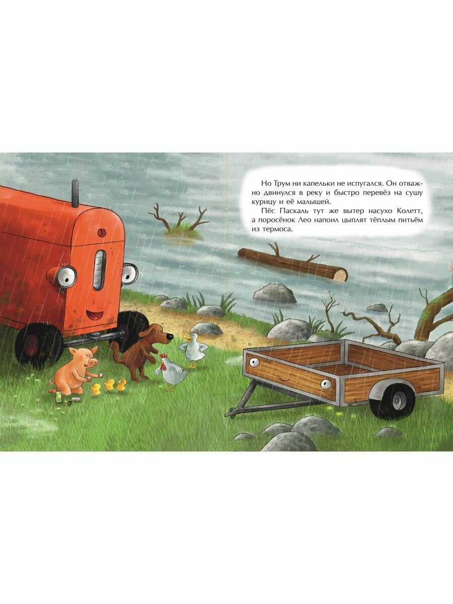 Новая книга про маленького красного Трактора и его друзей! Истории о дружбе, понимании, взаимовыручке и настоящем счастье покорили сердца тысяч детей. Маленький красный Трактор Трум гордится своим сильным и храбрым папой и хочет быть похожим на него. Однажды папа предложил малышу совершить невероятный спуск с самой высокой горки фермы, ведь трактор должен быть готов прийти на помощь товарищам в любой ситуации. Но внезапно начался ливень, и прямо во время спуска Трум поскользнулся. Теперь малыш боится выезжать на улицу во время дождя. Но случилась беда! Курица вместе с цыплятами осталась на крошечном острове, который вот-вот уйдет под воду из-за ливня. Сможет ли Трум победить свой страх и спасти друзей от гибели?