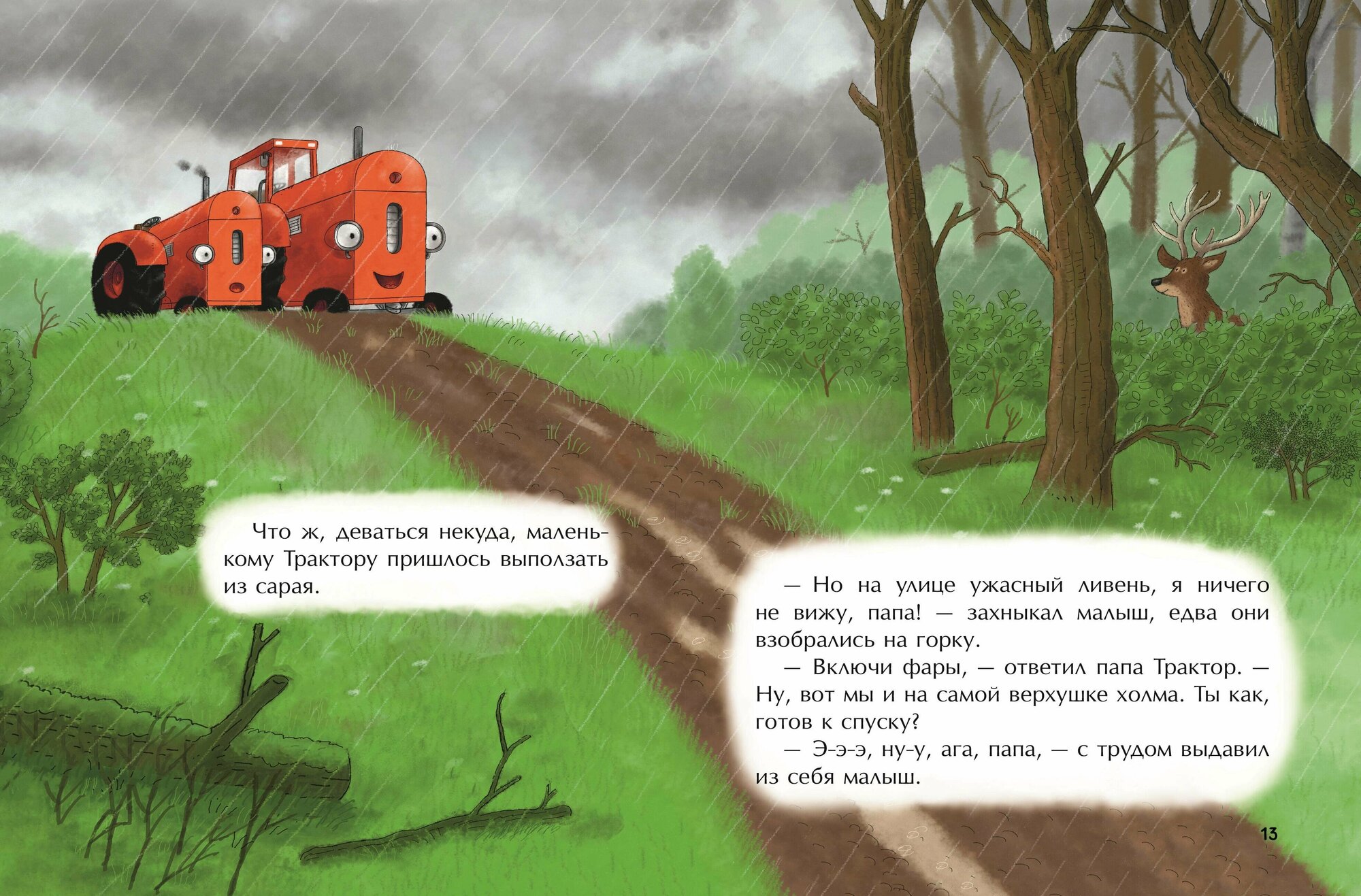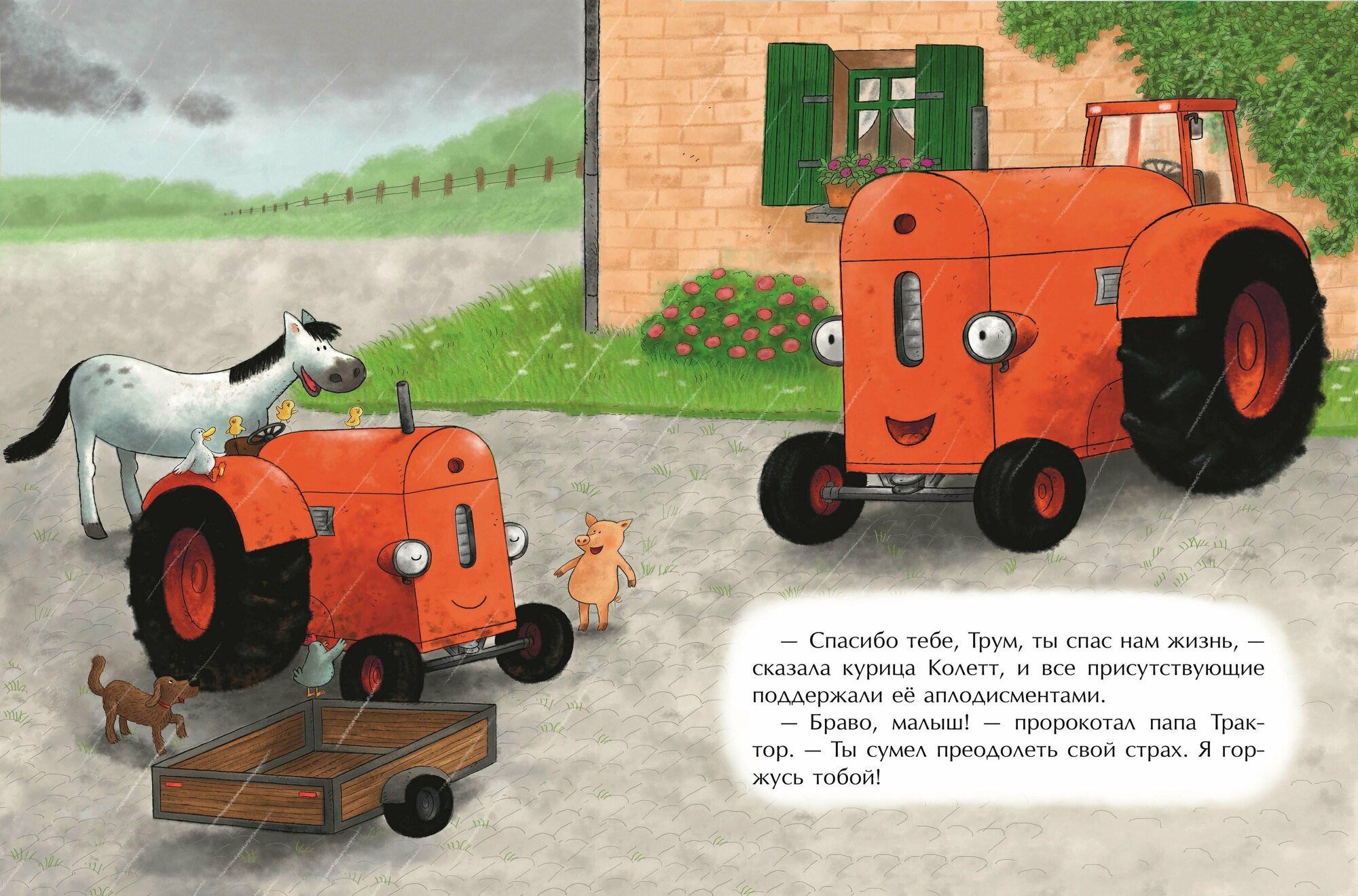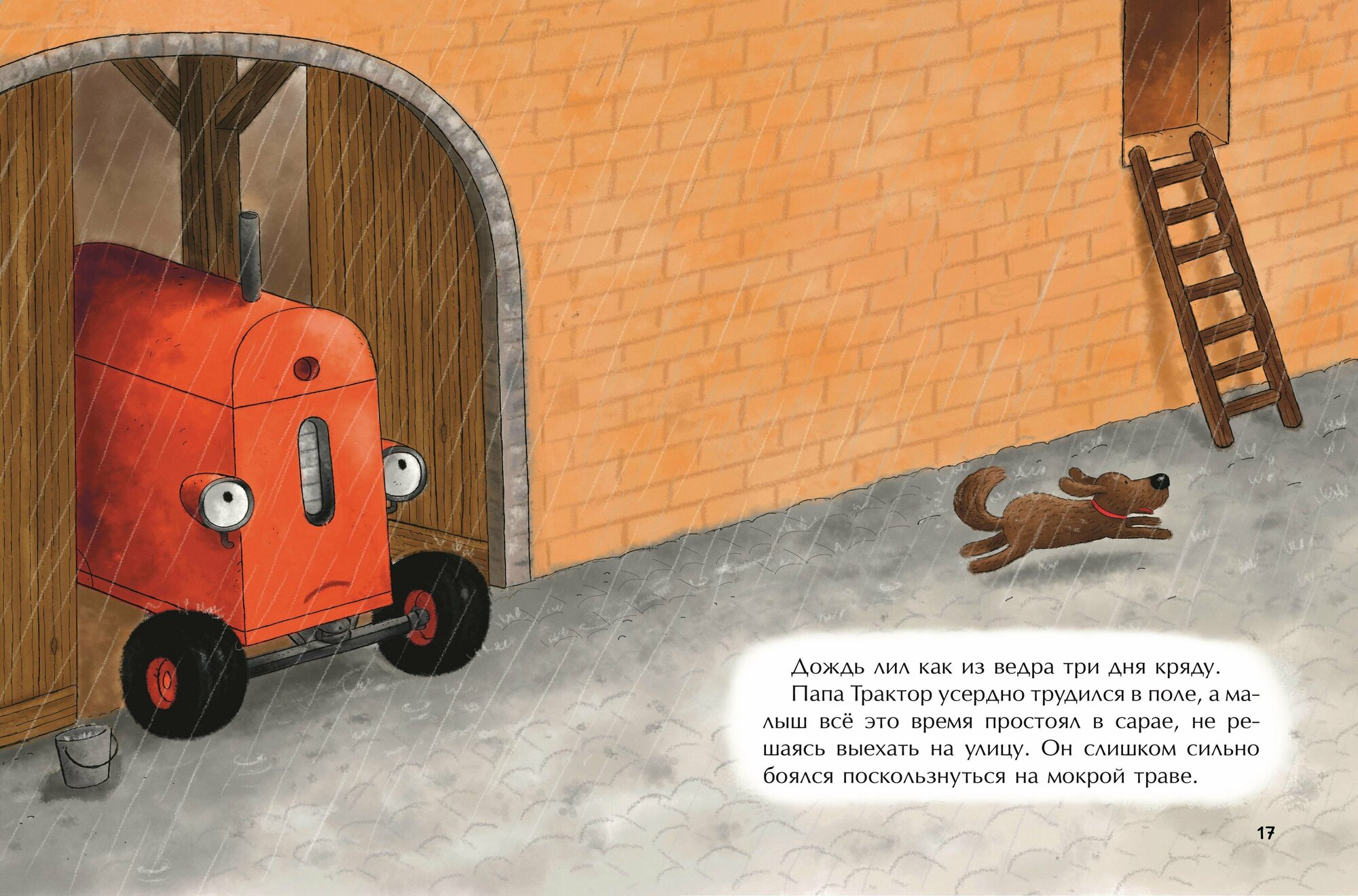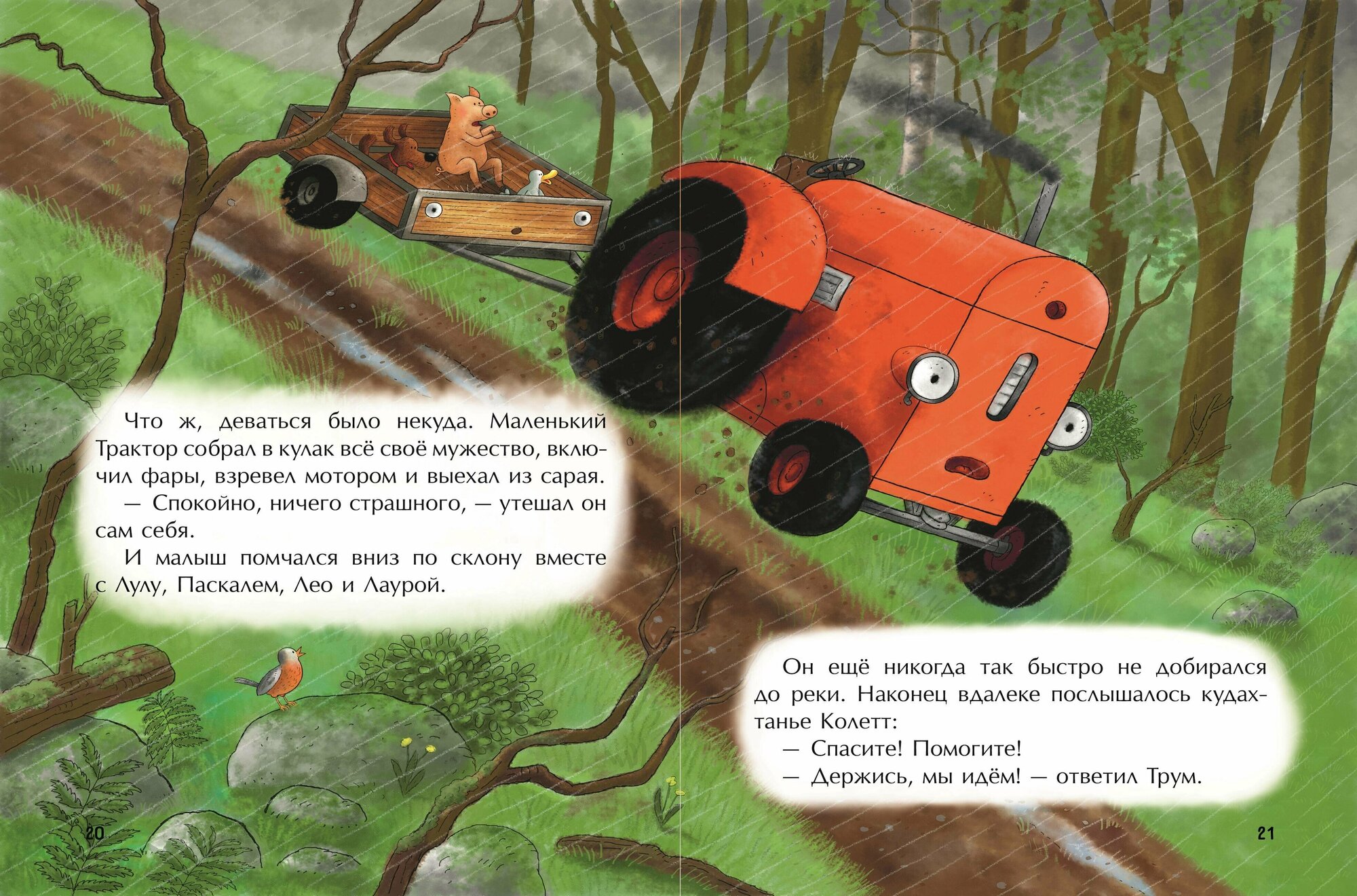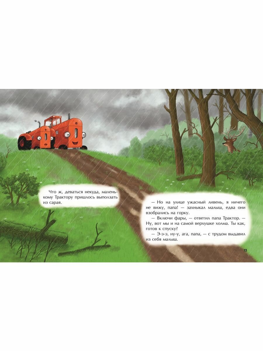Новая книга про маленького красного Трактора и его друзей! Истории о дружбе, понимании, взаимовыручке и настоящем счастье покорили сердца тысяч детей. Маленький красный Трактор Трум гордится своим сильным и храбрым папой и хочет быть похожим на него. Однажды папа предложил малышу совершить невероятный спуск с самой высокой горки фермы, ведь трактор должен быть готов прийти на помощь товарищам в любой ситуации. Но внезапно начался ливень, и прямо во время спуска Трум поскользнулся. Теперь малыш боится выезжать на улицу во время дождя. Но случилась беда! Курица вместе с цыплятами осталась на крошечном острове, который вот-вот уйдет под воду из-за ливня. Сможет ли Трум победить свой страх и спасти друзей от гибели?
