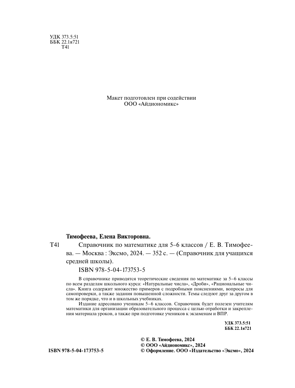 Справочник по математике для 5-6 классов (Тимофеева Елена Викторовна); ООО "Издательство "Эксмо", 2024