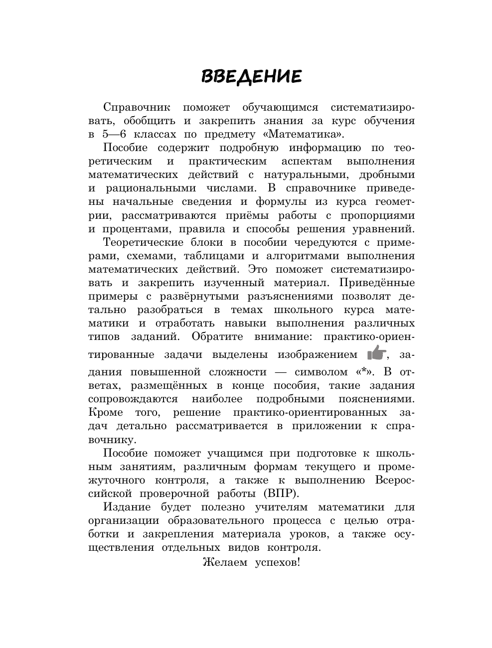 Справочник по математике поможет школьникам 5-6 классов не только подготовиться к урокам, экзаменам и ВПР, но и понять этот сложный предмет! Основываясь на богатом опыте преподавания и подготовки к экзаменам, автор систематизировал обширные теоретические сведения по основным математическим разделам и изложил их простым и доступным языком. Книга содержит множество поясняющих рисунков, графиков и чертежей: так изучать предмет намного проще и эффективнее. Таблицы помогут систематизировать и лучше усвоить информацию, а примеры решения задач с разборами и задания для самопроверки закрепить изученное. Справочник соответствует школьной программе по математике для 5-6 классов. В конце пособия приводятся ответы ко всем заданиям. С этой книгой математика станет понятной даже тем, кто всегда с трудом ориентировался в математических вычислениях! Благодаря интегральному переплету справочник школьника прослужит долгие годы.
