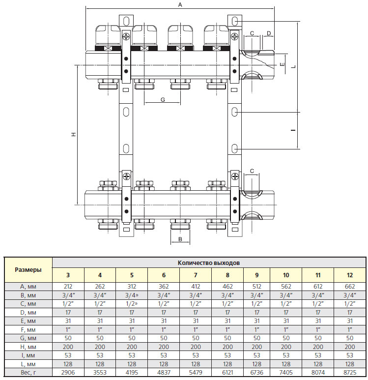 | Описание | Коллекторный блок для систем водяного радиаторного и напольного отопления (водяной теплый пол) с регулировочными (настроечными) и ручными (с возможностью установки электротермического сервопривода) запорными клапанами, автоматическими воздухоотводчиками и дренажем. Диаметр коллекторов – 1 или 1 1/4". Число выходов – от 3 до 12. Диаметр патрубков – 3/4", резьба – наружная, стандарт присоединения – «евроконус». Рабочая температура теплоносителя – до 120 °С, давление – до 10 бар.,,Размер - 1", 4 x 3/4", "евроконус" |